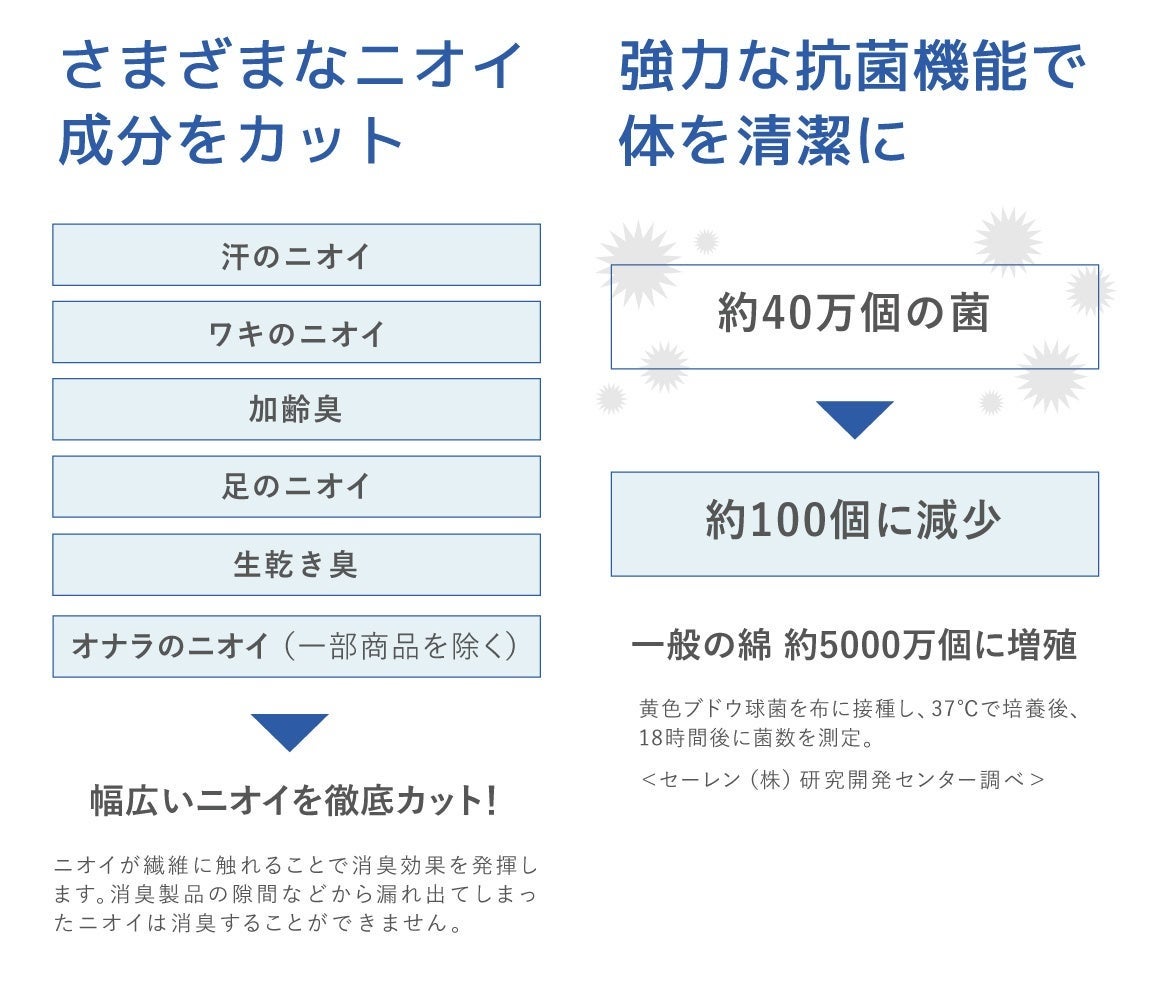 ナノレベルの特殊セラミックスでニオイを吸着し、金属イオンでニオイを分解する消臭メカニズムを開発し、加齢臭や汗などの体臭やおならなど身体から発せられる多様な“ニオイ”を瞬間的に消臭し、かつ洗濯にも耐久性をもつ素材を開発することに成功しました。