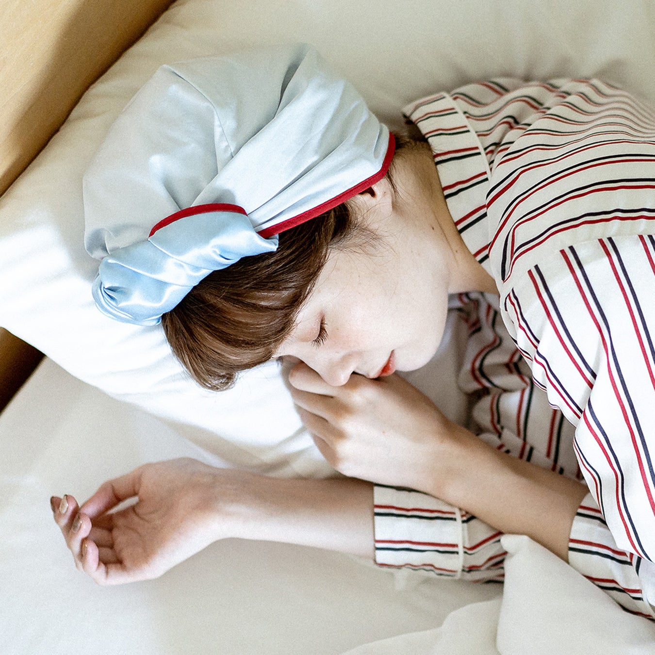 美髪効果の秘訣は、帽子の中で髪を固定して寝具との摩擦を抑えること。また、素材に調湿効果の高いシルクを用いることで、寝ている間の汗を逃がしながら乾燥を防ぐことが可能。寝癖の防止にもなり、朝の時短にも。