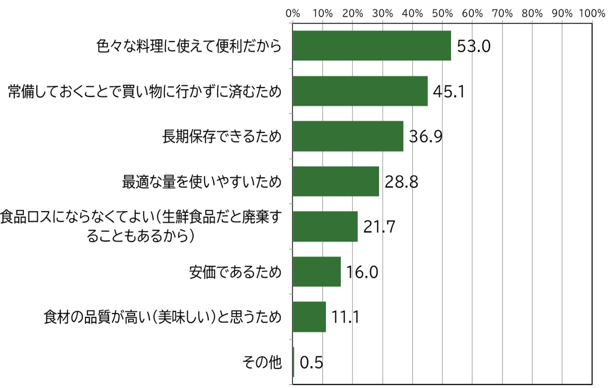 冷凍食材の果物・野菜・魚・肉(豚・鶏・牛)を購入する頻度について聞いたところ、「毎週月に2~3回」40.2%、「月に1回」16.3%、「数か月に1回」11.2%と、合計で67.7%と多くの人が冷凍食材を活用していることが明らかになった。その理由を聞いたところ、「色々な料理に使えて便利だから」53.0%、「常備しておくことで買い物に行かずに済むため」45.1%、「長期保存できるため」36.9%という順に高い回答となり、消費期限を気にせずにいつでも様々な料理に活用できる点が評価されていることが明らかになった。