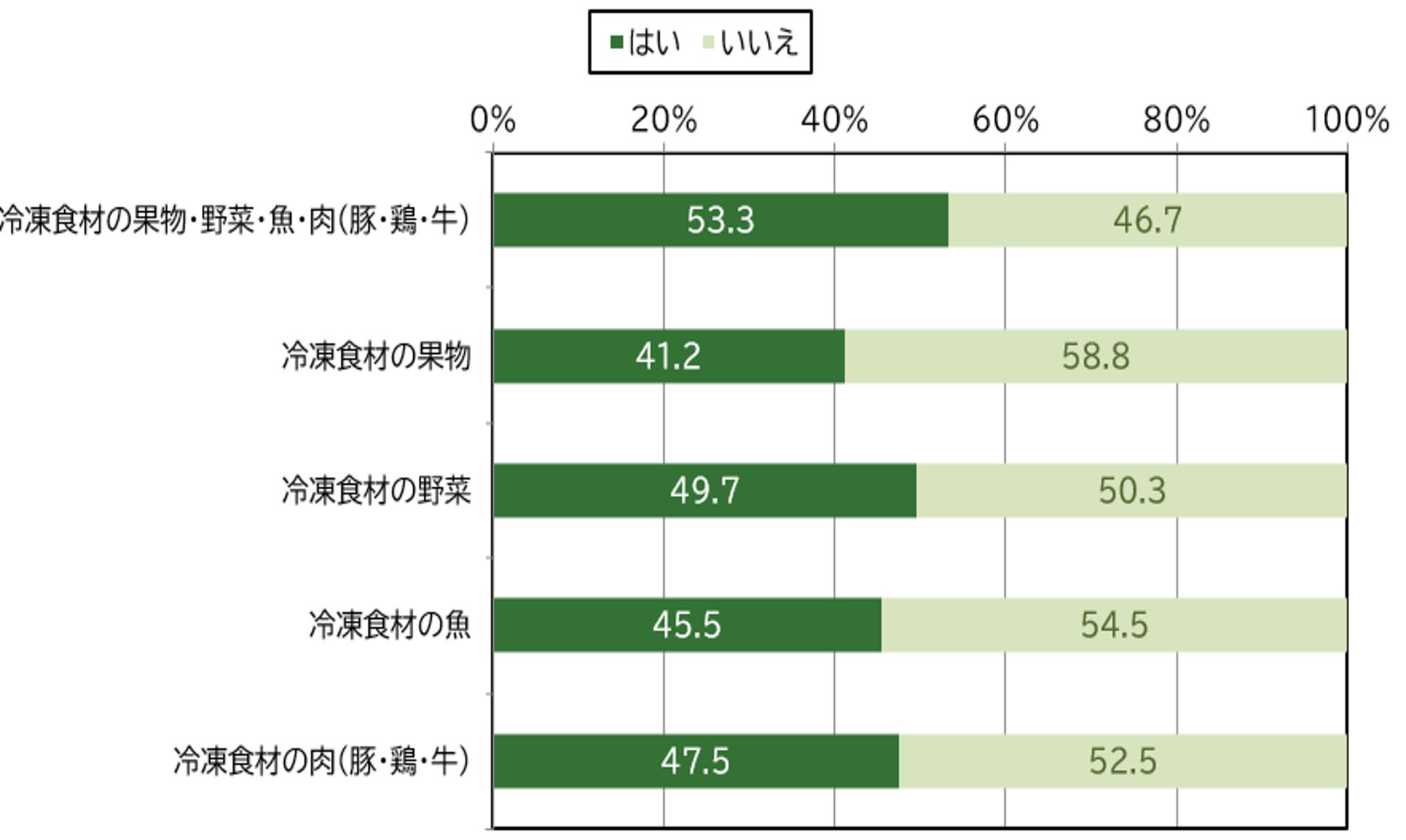 冷凍食材の果物・野菜・魚・肉(豚・鶏・牛)について今後購入していきたいか聞いたところ、「はい」が53.3%となり、「冷凍食材の野菜」49.7%、「冷凍食材の肉(豚・鶏・牛)」47.5%、「冷凍食材の魚」45.5%、「冷凍食材の果物」41.2%の順に高い意向が見られた。