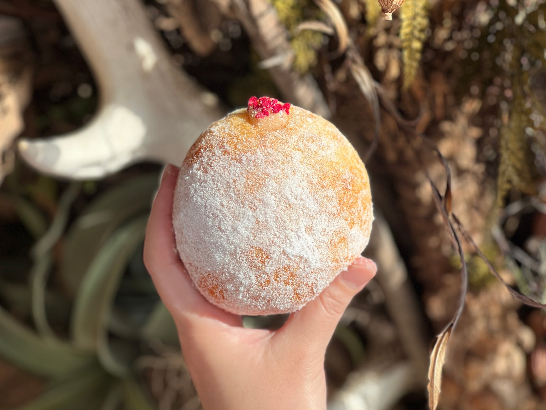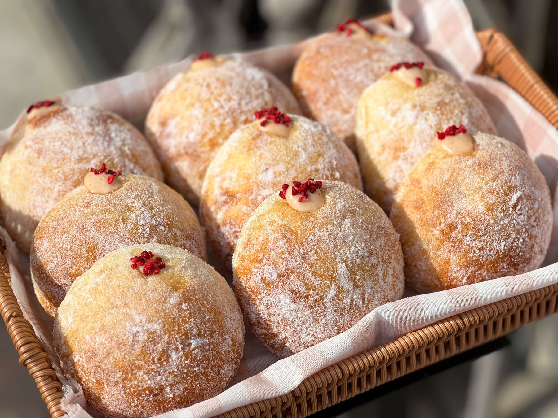 自家製濃厚カスタードに苺チョコレートを混ぜ込み、フリーズドライしたベリーを添えた生ベーグルドーナツ。