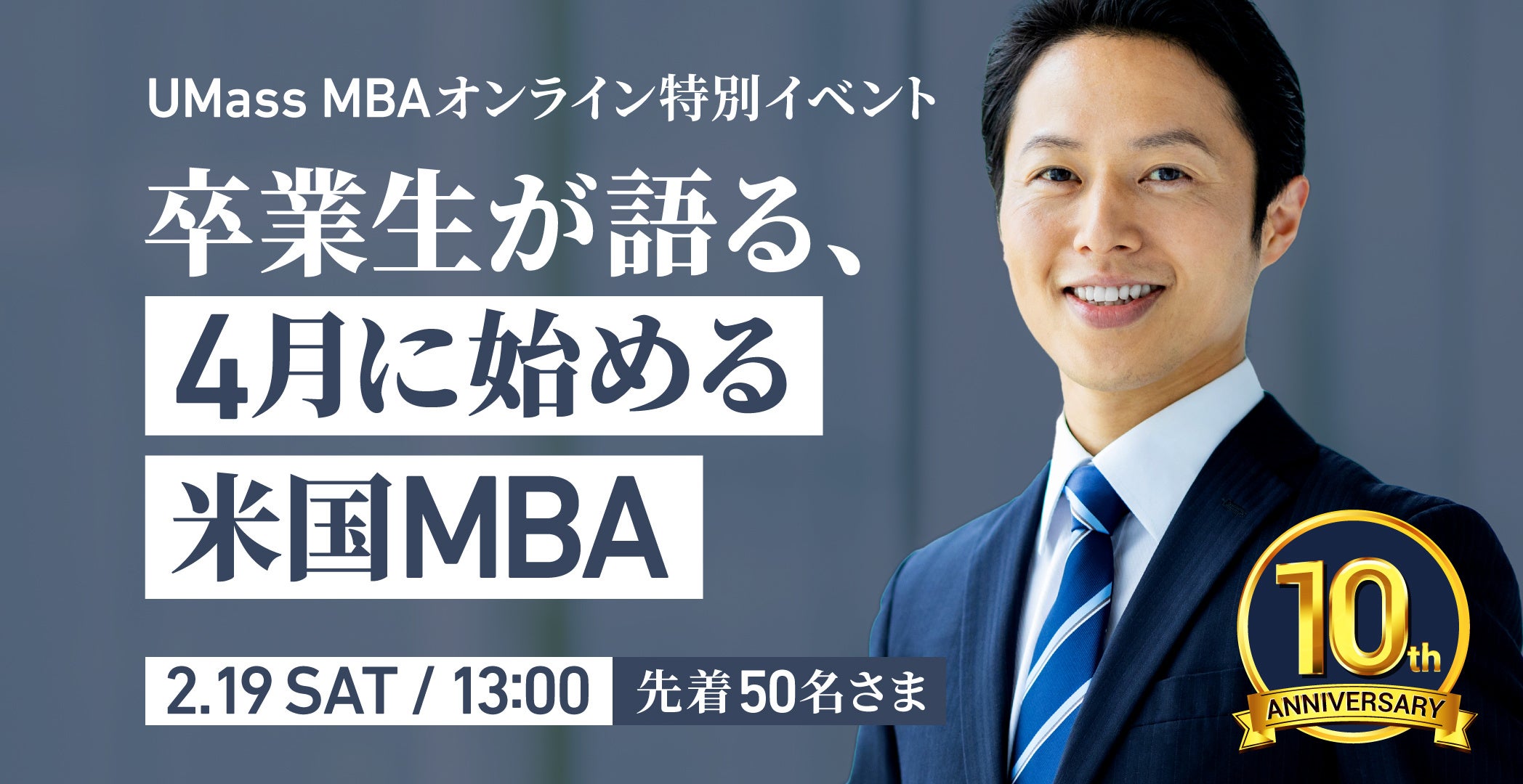 留学不要、完全オンラインで米国MBA(経営学修士)を取得できる「マサチューセッツ大学MBAプログラム」は2月19日(土)、オンライン特別イベント「卒業生が語る、4月に始める米国MBA」を開きます。4月入学の25期生の募集締め切りを間近に控え、春入学した卒業生3人から、年度初めにチャレンジした理由や、どのように仕事と両立しながら学習したか、卒業後の転職などについて聞くことができます。参加無料。予約はこちらから。https://www.abitus.co.jp/mba/