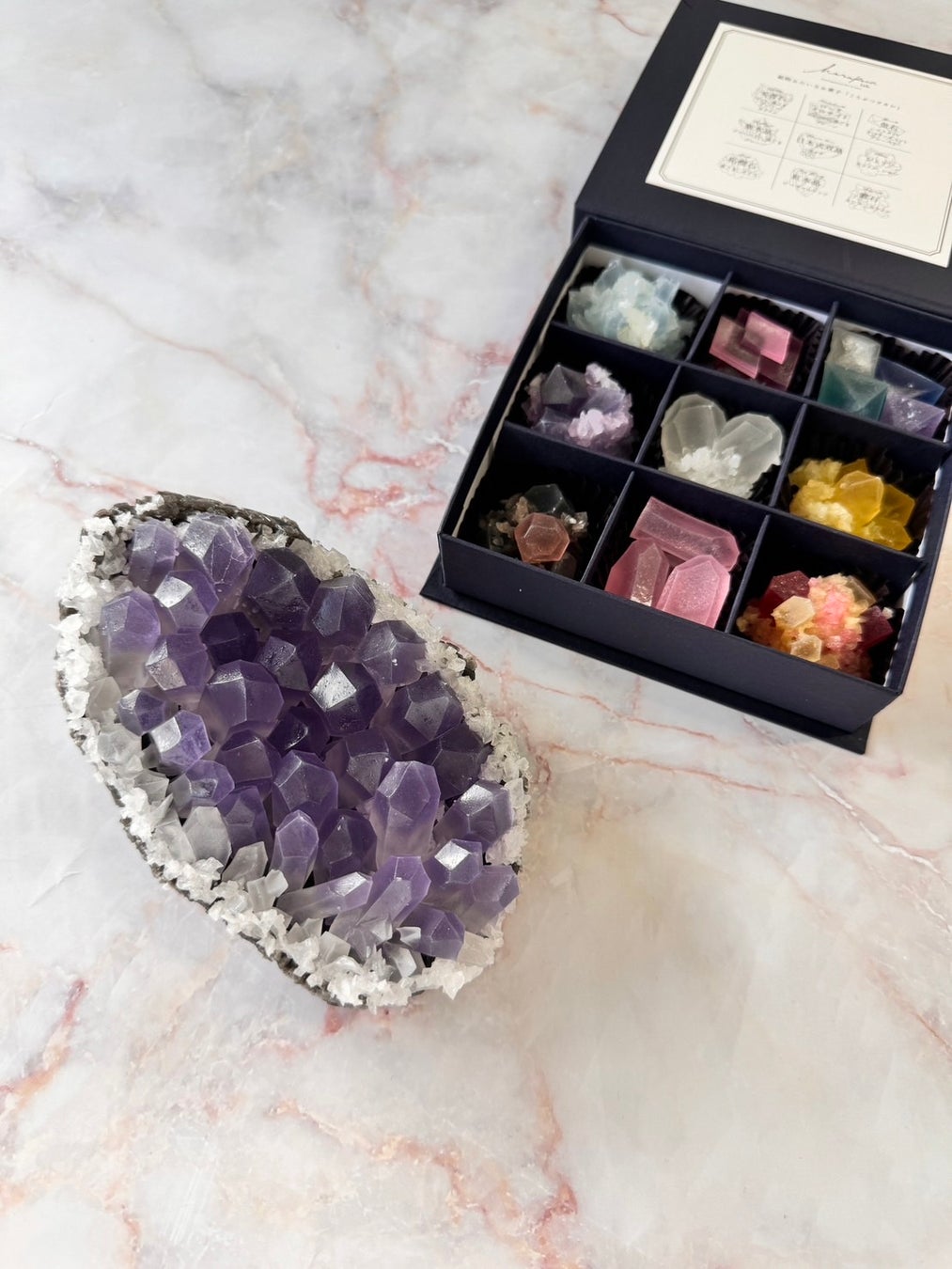 ハラペコラボ大阪店が、2024年9月5日より〖 秋の鉱物みたいなこうぶつ展 〗の開催をスタートした。鉱物や宝石をモチーフとした琥珀糖〝こうぶつヲカシ〟を中心に、<天然石アクセサリー>、鉱物をモチーフにした<石鹸>や<キャンドル>、そして、<イラスト、雑貨>が店内に並ぶ。