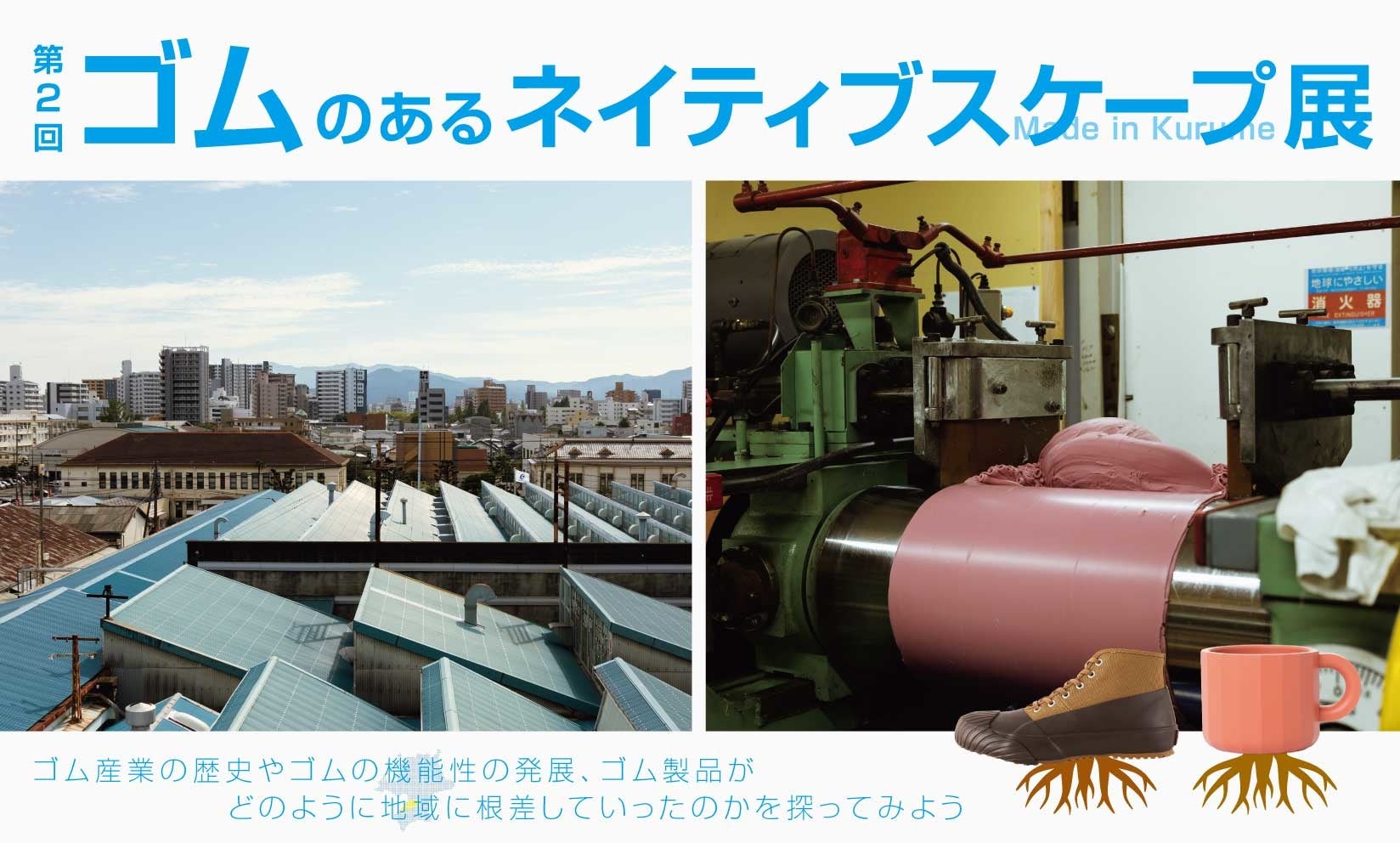 スニーカーや運動靴を製造するメーカー「ムーンスター」をはじめとするゴム製造会社とゴムのまち「久留米」の関係性を軸として、 ゴムの歴史や機能性の移り変わり、久留米で暮らす人々の暮らしの中で、ゴムがどのように地域に根付いていったのか、そのネイティブスケープをうなぎの寝床と一緒に見ていきましょう。