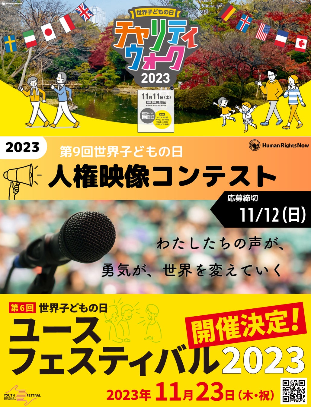 ①人権映像コンテスト(主催)~11月12日(日)まで募集 ②チャリティーウォーク(主催)11月11日(土)開催! ③ユースフェスティバル(後援)11月23日(木祝)開催!