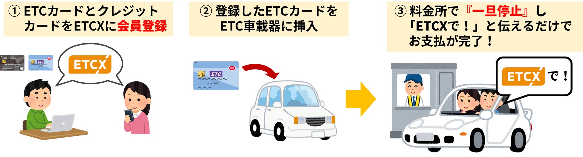 ETCカードとクレジットカードを用いて、予め『ETCX』に会員登録を行ったのち、会員登録したETCカードを車載器に挿入することで、高速道路以外の有料道路、ガソリンスタンドなど、『ETCX』ロゴマークが掲示してある施設・店舗で車に乗ったまま、利用料金や買い物代金をお支払いすることができます。