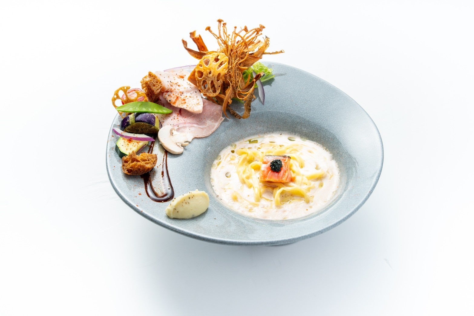 さらに、有田焼の窯元と開発したフレンチラーメンのオリジナル器を採用し、熱・香り・美しさを支える食体験へと昇華させました。