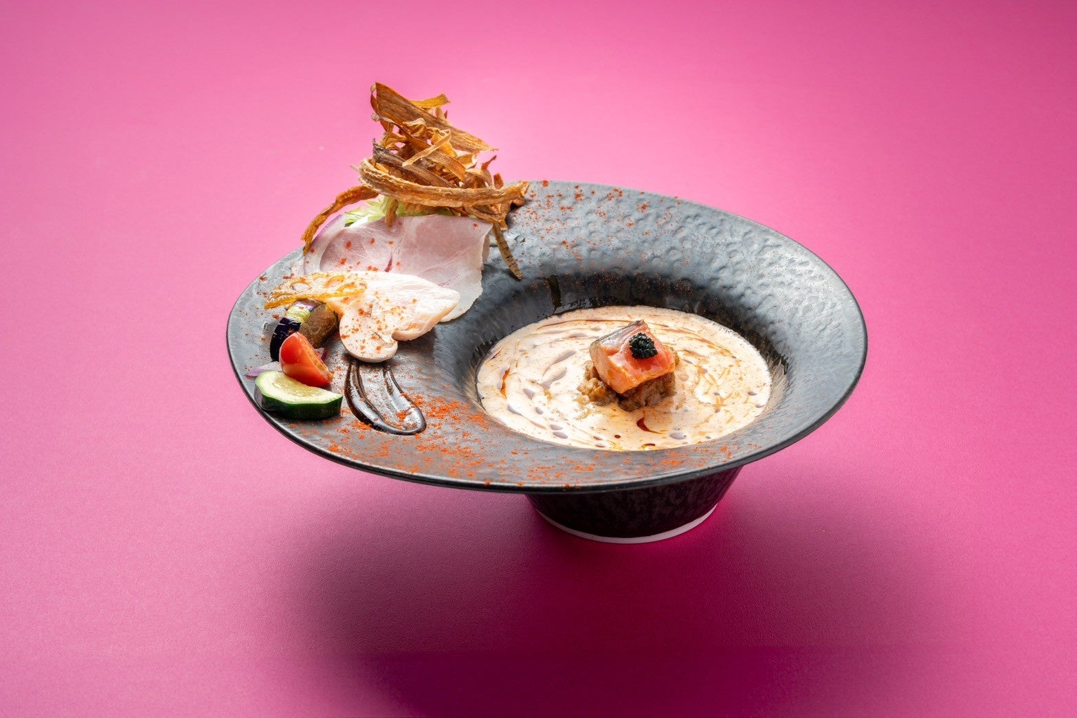 重厚感のある黒の器は、白濁スープとのコントラストが際立ち、料理全体に静謐な力強さを添えます。 一方、グレーを基調とした貫入模様の器は、サーモンピンクや多彩なトッピングを引き立て、落ち着いた上質感を演出します。