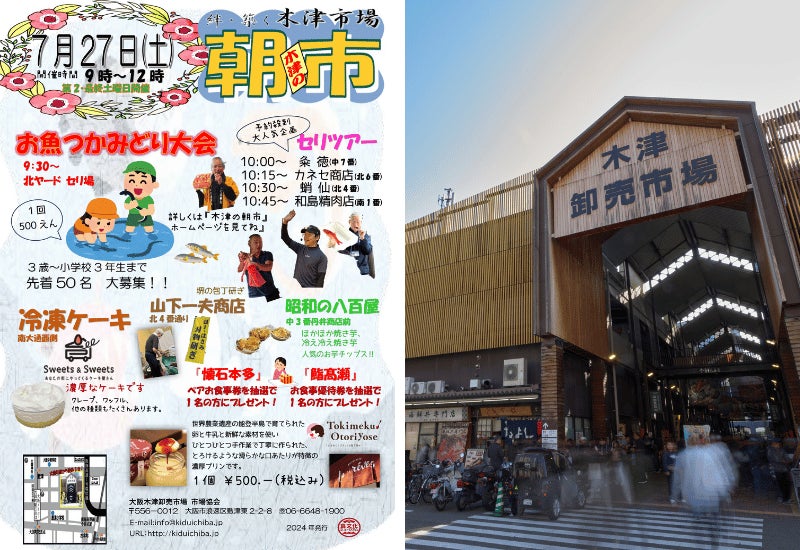 大阪木津卸売市場は、大阪なんば近くの大阪浪速区にある民営の卸売市場です。民営の卸売市場としては、全国有数の取り扱い実績を誇り、1万7500平方メートルの敷地内に青果や水産物のセリ場を設け、約150店舗の卸商が入居。毎月第2・最終土曜日に「木津の朝市」を開催。魚介類や精肉などが安値で購入でき、市場体験ができます。マグロの解体ショーなどイベントも行われその活気には圧倒されます。