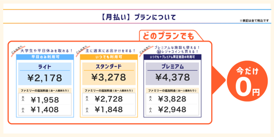 内容:キャンペーン期間中に新規会員登録した方に限り、会員登録時にお支払いいただく初月会費と、キャンペーン期間中のファミリー追加登録費用が全て無料。プランは3つの月払いプランからお好きなプランを選択可能。