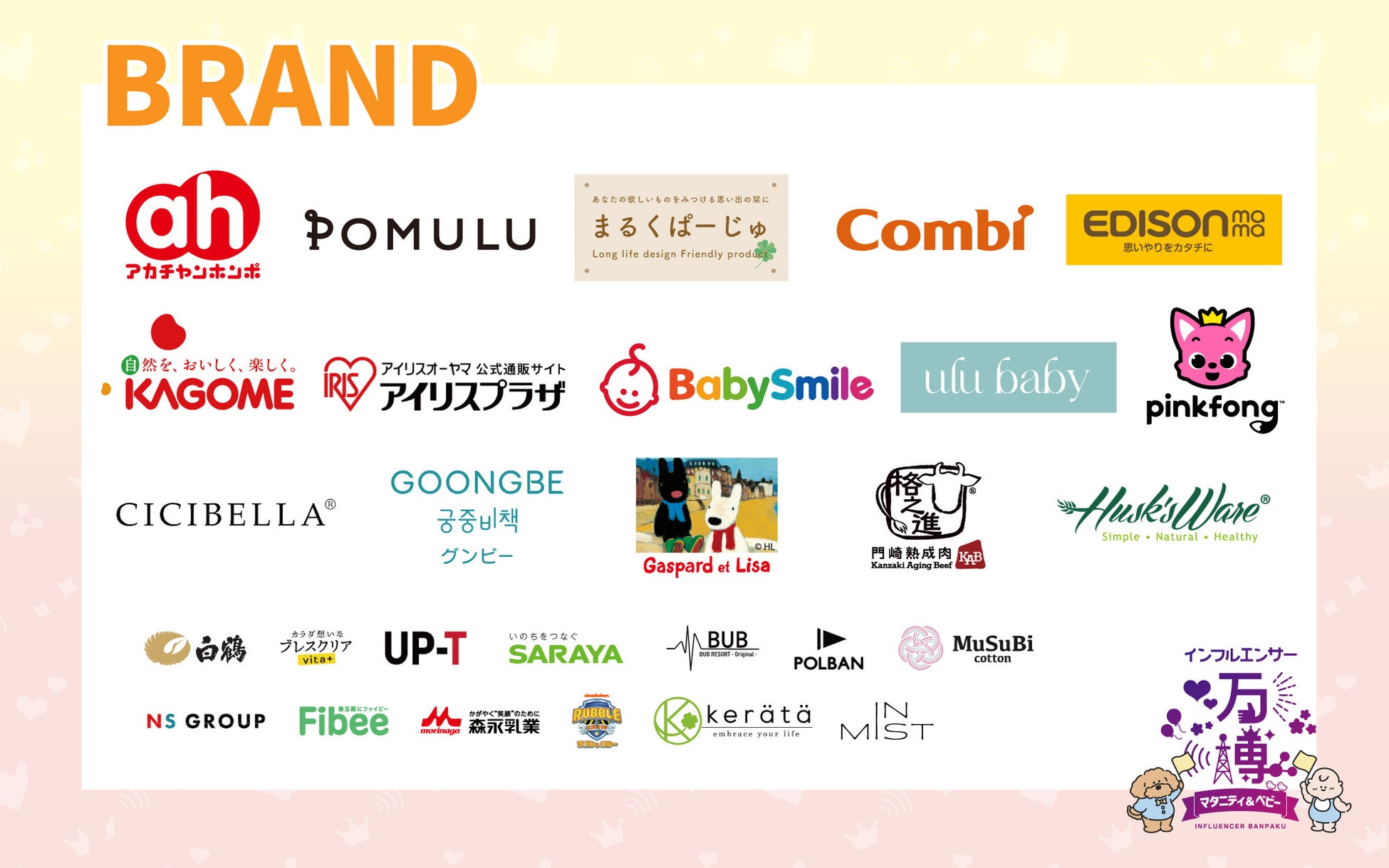 アカチャンホンポ(株式会社赤ちゃん本舗)/アイリスオーヤマ公式通販サイト「アイリスプラザ」/Husk’s Ware/コンビ株式会社「auto N(オートエヌ)」/株式会社ケイジェイシー「EDISONmama|エジソンママ」「GOONGBE(グンビー)」/REALIZE合同会社「POMULU」/カゴメ株式会社「トマトペースト」「じょうずに野菜」/株式会社おぎそ「まるくぱーじゅ」/シースター株式会社「BabySmile」/道端アンジェリカプロデュース「ulu baby」/Labella株式会社「CICIBELLA」/株式会社門崎「熟成肉 格之進」/株式会社ソニー・クリエイティブプロダクツ「リサとガスパール」/ピンクフォン・ジャパン株式会社「Pinkfong」