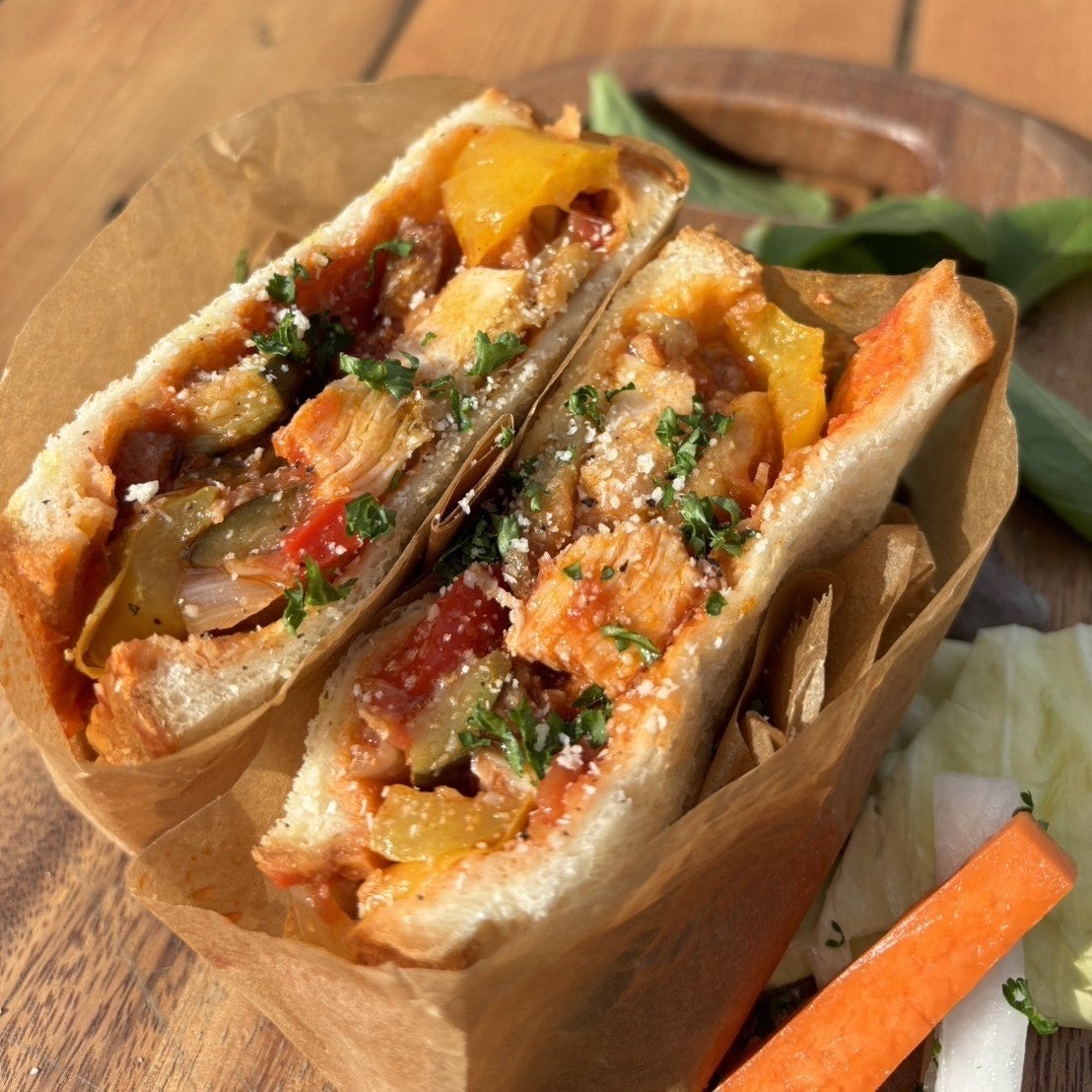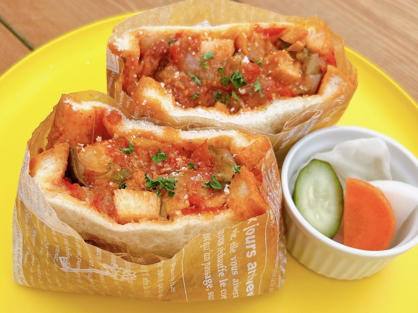 カフェのフードメニューには、ジューシーな牛ロースのステーキサンド、完熟トマトのカポナータサンド。サブメニューは、やみつきガーリックシュリンプやライスコロッケなどを揃え、BBQのお共にもおすすめです。