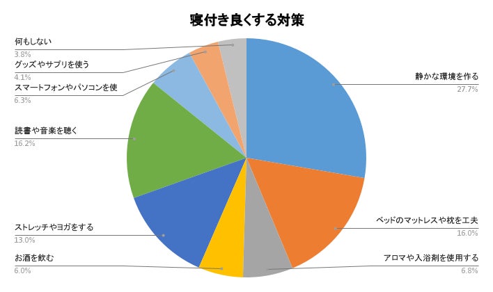 寝付きを良くする対策で一番多かったのは、静かな環境を作る27.7%となりました