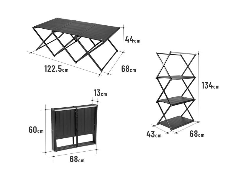 製品名:タナカテーブルL 型番・カラー:TB4-096-BK・ブラック 販売価格(税込):16,500円 サイズ:[テーブル時](約)W122.5×D68×H44cm [ラック時](約)W68×D43×H134cm、各棚内寸は(約)W61.2×D40×H40cm 収納サイズ:(約)W68×D60×H13cm 総重量:(約)5.7kg 材質:アルミ合金 静止耐荷重:[テーブル時]40kg [ラック時]棚板一枚あたり10kg セット内容:製品本体、タイベルト |