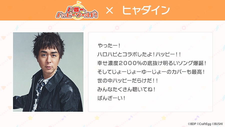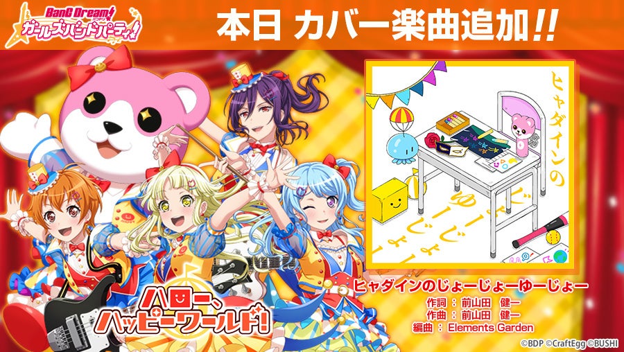 株式会社Craft Egg(本社:東京都渋谷区 代表取締役:森川 修一、以下、Craft Egg)と、株式会社ブシロード(本社:東京都中野区 代表取締役社長:橋本 義賢、以下、ブシロード)の共同制作によるスマートフォン向けゲーム「バンドリ! ガールズバンドパーティ!」(以下、ガルパ)は、2022年6月30日(木)より、アーティストタイアップ第5弾として「ハロー、ハッピーワールド!×ヒャダイン」を実施し、ヒャダインさんからハロー、ハッピーワールド!への提供楽曲『Happy! Happier! Happiest!』をゲーム内に追加いたしました。
