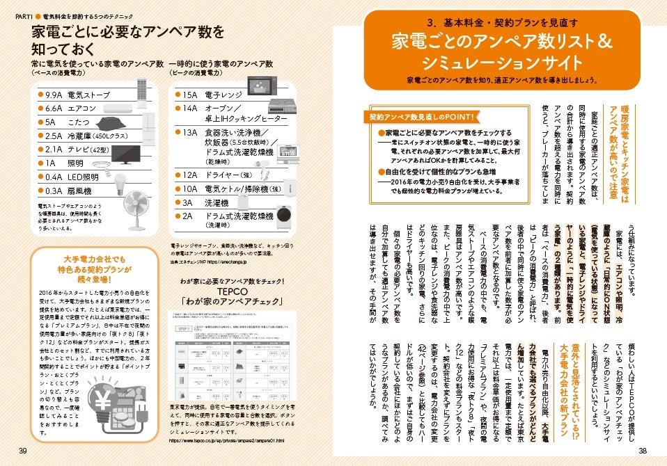 これ以外にも、冷蔵庫やキッチン家電、電気給湯器などの節約術も大公開するほか、電気料金の契約プランの見直し方やアンペア数の変更の仕方などについてもくわしく紹介しています。