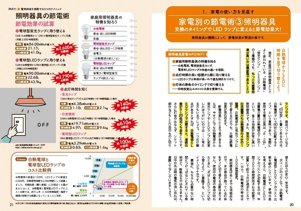 そして、家庭において電力を消費しやすいものは何なのかを明らかにし、エアコン、冷蔵庫、キッチン家電、照明器具などの電力をとことん抑える節約術を紹介するほか、注意が必要な待機電力や省エネ家電の買い替え方、電力会社・電気料金プランの乗り換え方まで、徹底的に節約を追及します。
