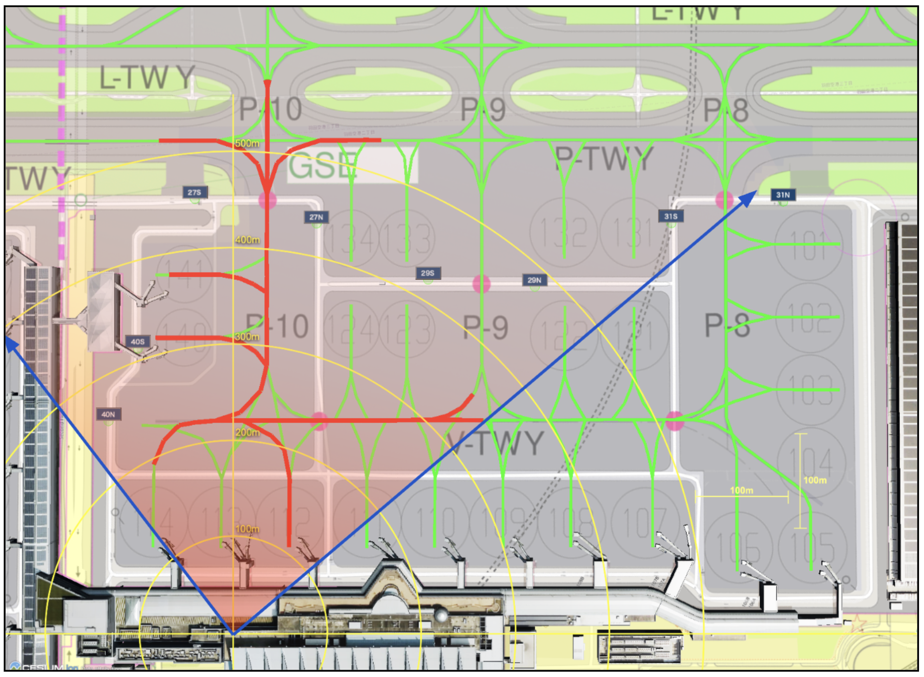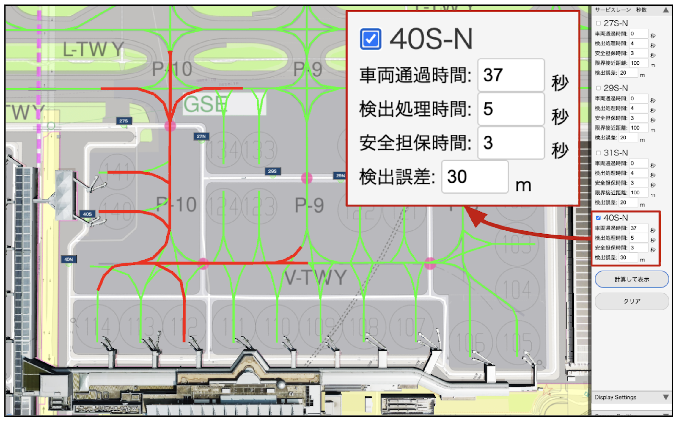 自動運転車両のブラストレーンやサービスレーンの通過時間を指定し、当該空港の監視すべき誘導路を自動で検出します。