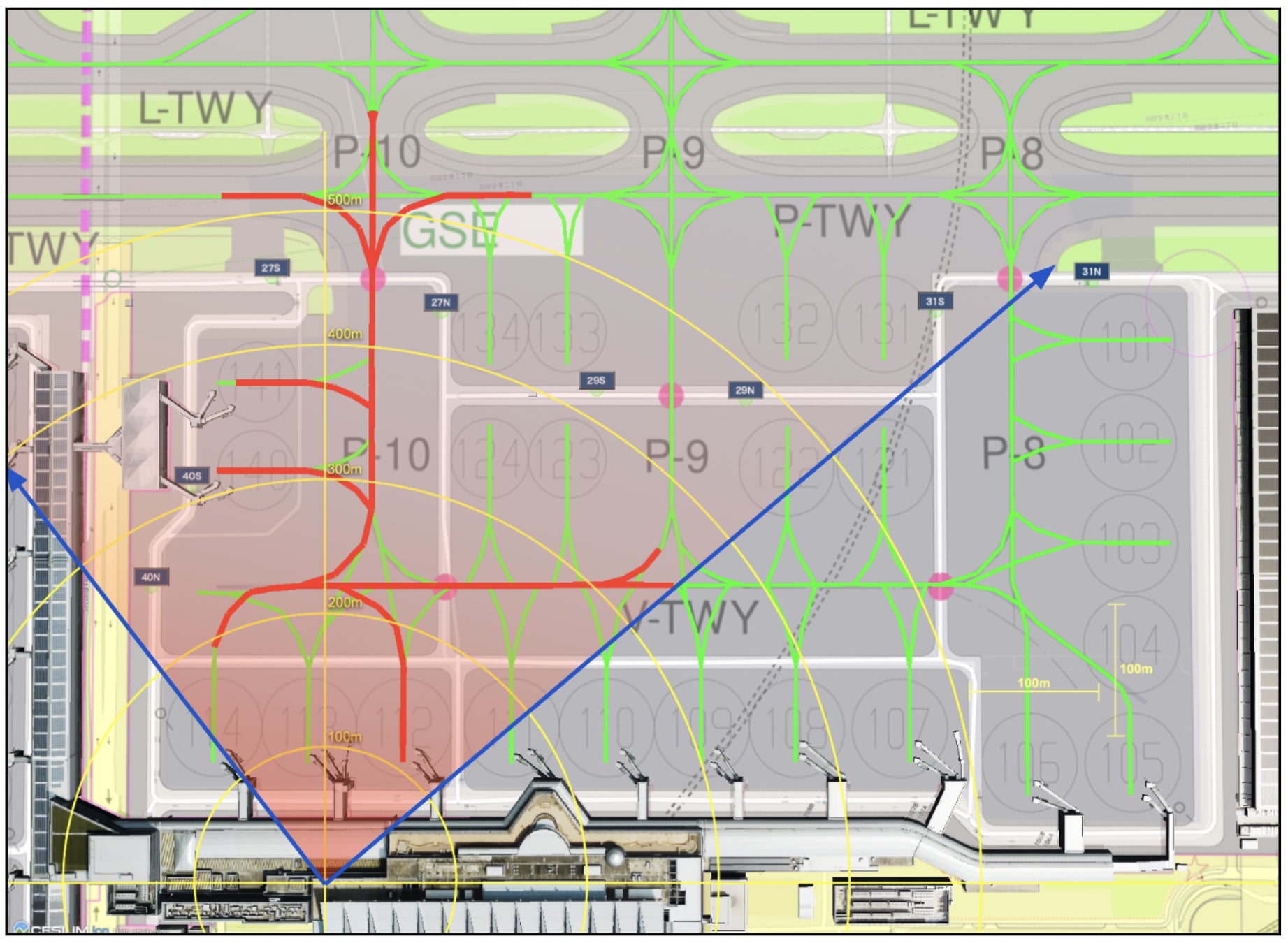 PDFの空港地図から誘導路をトレースし、航空機の経路情報を迅速に整備。CARATS(航空交通流管理用データ)を活用した最大速度情報の取り込みにも対応しました。
