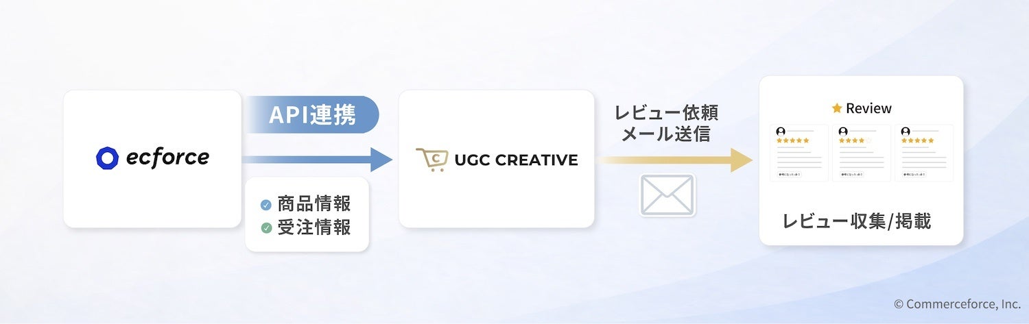 本API連携により、商品情報・注文データなどの連携が可能となり、商品購入者によるレビュー依頼を自動化させ、ecforceとUGCクリエイティブを導入するEC運用担当者の業務効率化とUGC生成・レビュー収集率の向上を実現させます。
