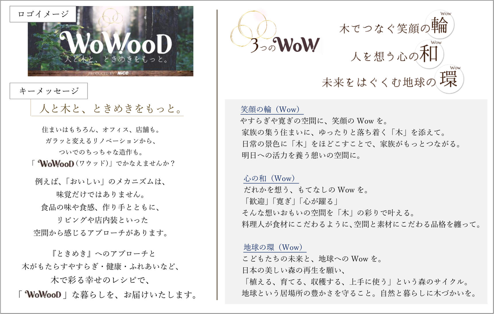 また、木でつなぐ笑顔の「輪」、人を想う心の「和」、未来をはぐくむ地球の「環」という意味も込めて います。木に魅せられ幸せを感じ、思わず「Wow」と口にしたくなるような「ひとときのときめきと、