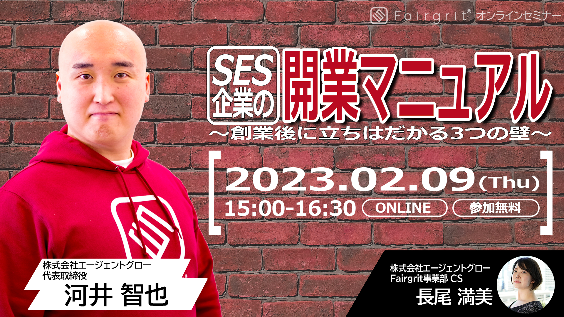 株式会社エージェントグロー(本社:東京都港区、代表取締役:河井智也)が毎月開催している無料オンラインウェビナー。2023年2月度は「SES企業の開業マニュアル 〜創業後に立ちはだかる3つの壁~」と「稼働率99.5%!AgentGrow流 「SES営業のHowTo」」の2本を開催いたします。