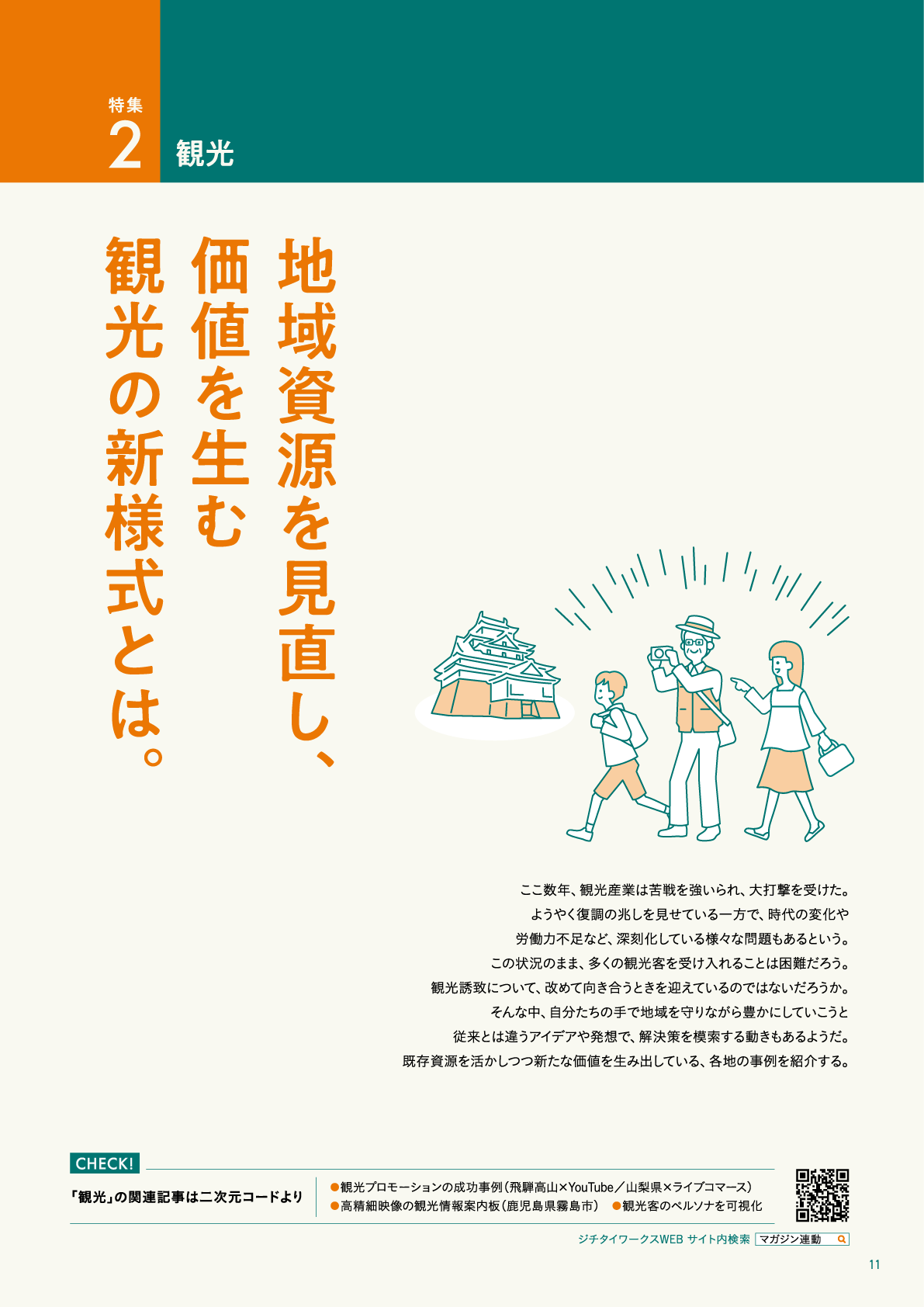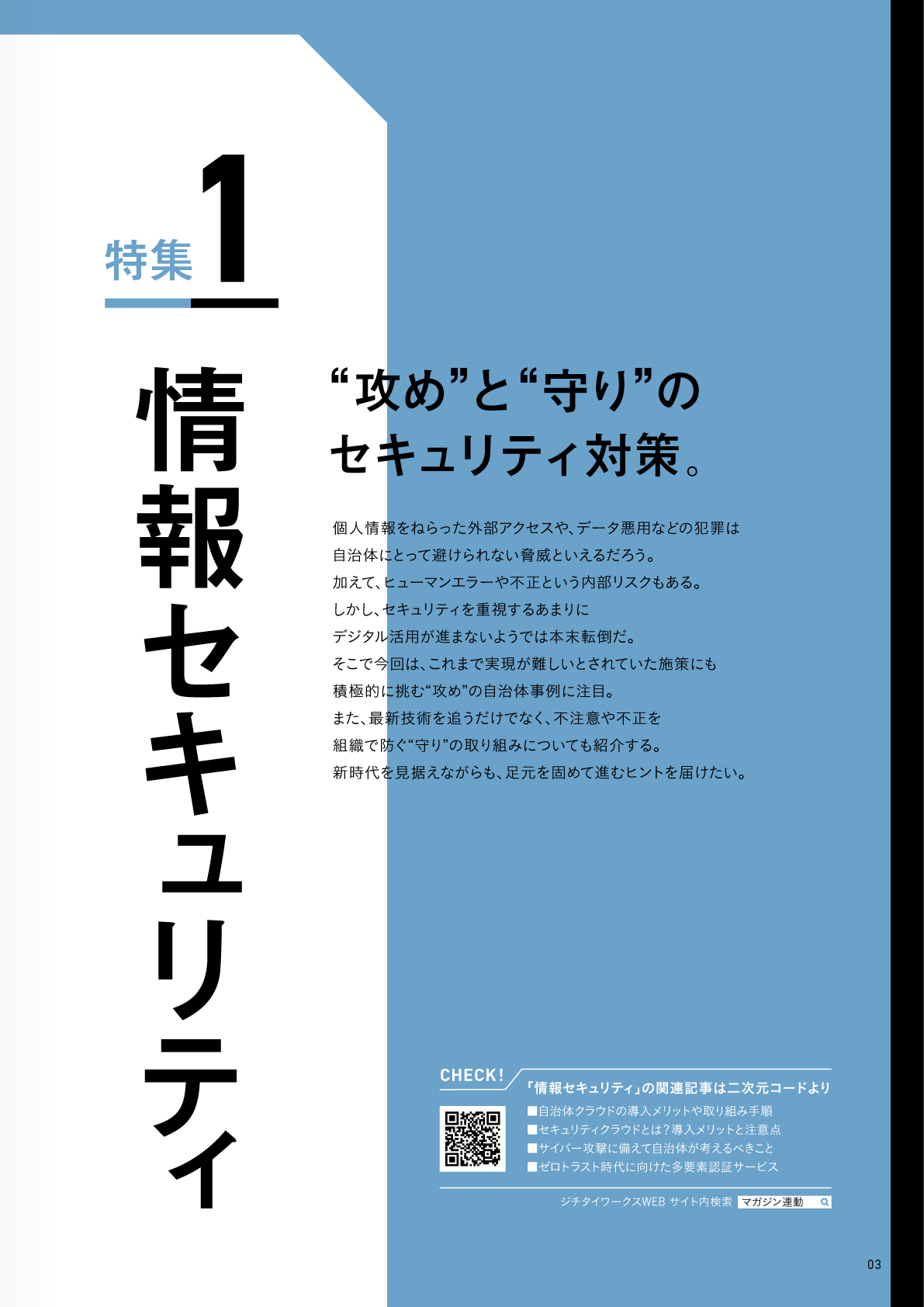 今号の特集1では、「[情報セキュリティ]“攻め”と“守り”のセキュリティ対策。」をテーマに、茨城県つくば市、福岡県飯塚市、岩手県釜石市の取り組みと、地方公共団体情報システム機構へのスペシャルインタビューをご紹介しております。特集2では、「[観光]地域資源を見直し、価値を生む観光の新様式とは。」をテーマに、熊本県小国町、北海道鹿追町、愛媛県大洲市の取り組みをご紹介しております。