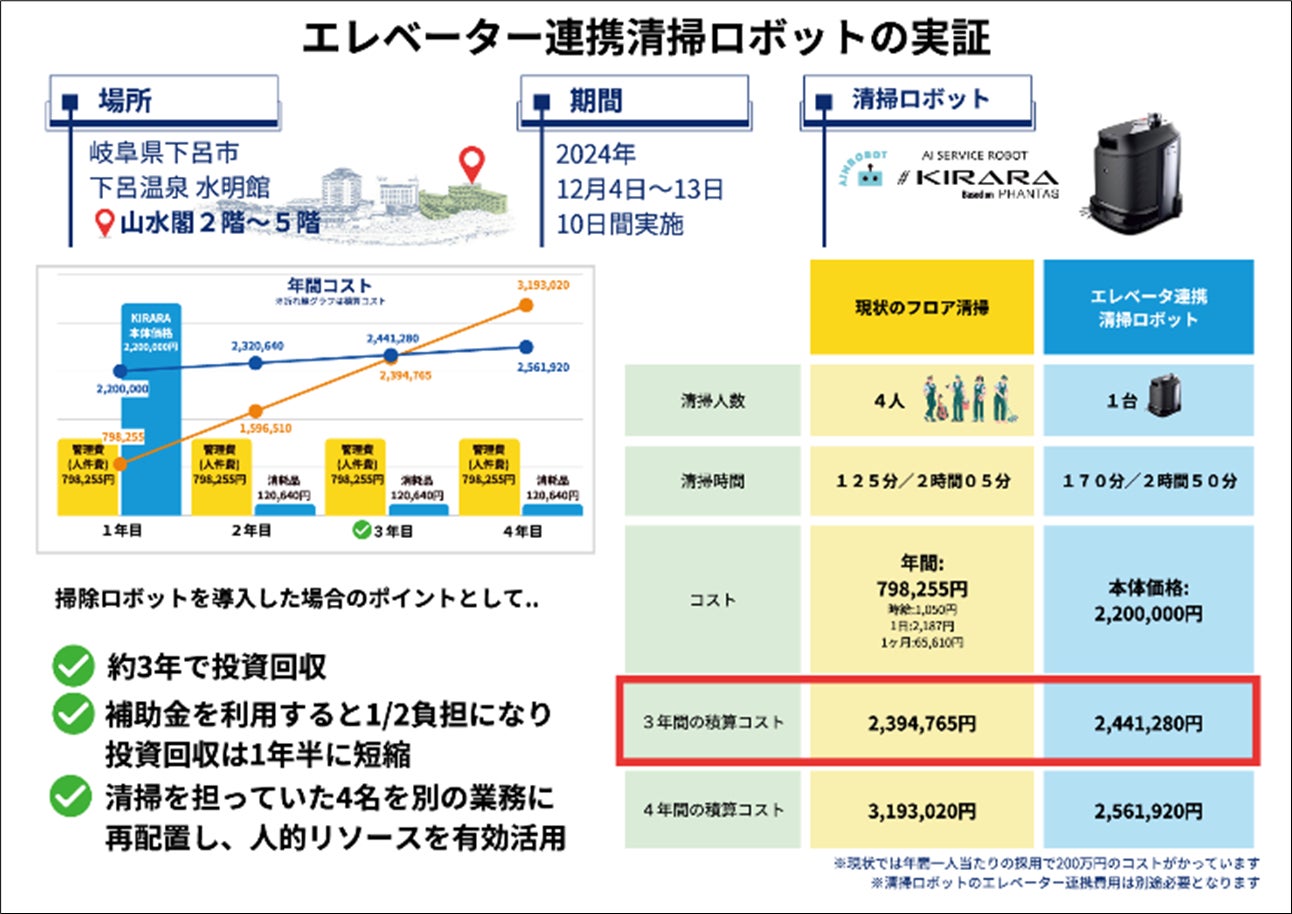 今回のシステムのひとつである清掃ロボットKIRARAについては、「プロが選ぶ日本のホテル・旅館100選2024年」の第2位に選ばれた下呂温泉水明館様にて実証を行い、トータルコスト及び、人的リソースの有効活用の点で評価いただきました。加えて、現在リネンサプライ会社からの搬送カートが軒先渡しされた後に、スタッフが各フロアに搬送する重労働を支援するために、リネン搬送カートをエレベータに連携させて自立乗降できるようにさせることで、自由に館内移動できることを目指し、水明館様とリネンサプライ会社様と一緒に搬送ロボットシステムの導入のためのプロジェクトを進めております。