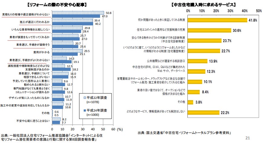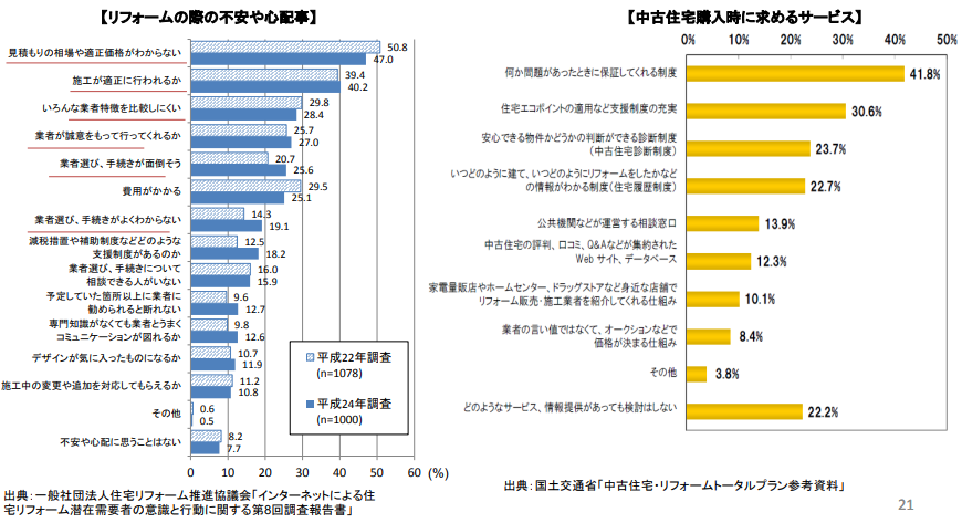 一方で、一般社団法人住宅リフォーム推進協議会「インターネットによると住宅リフォーム潜在需要者の意識と行動に関する第8回調査報告書」によるとリフォームに対する消費者の声としては半数近くが「適正価格がわからない(不透明)」と回答。また、「適正な施工」、「誠意ある対応」、「業者選び」などリフォーム業者に関わる点について心配していることがわかっています。