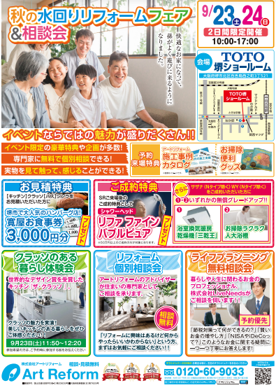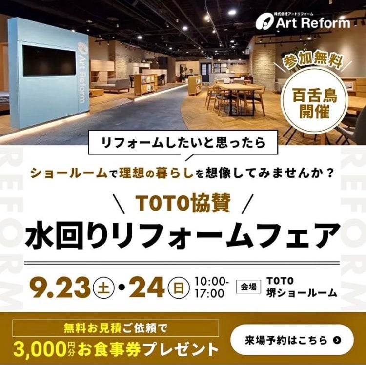 アートリフォーム、2023年5月に移転オープンしたTOTO堺ショールームで『秋の水回りリフォームフェア&相談会』を9/23〜9/24に開催