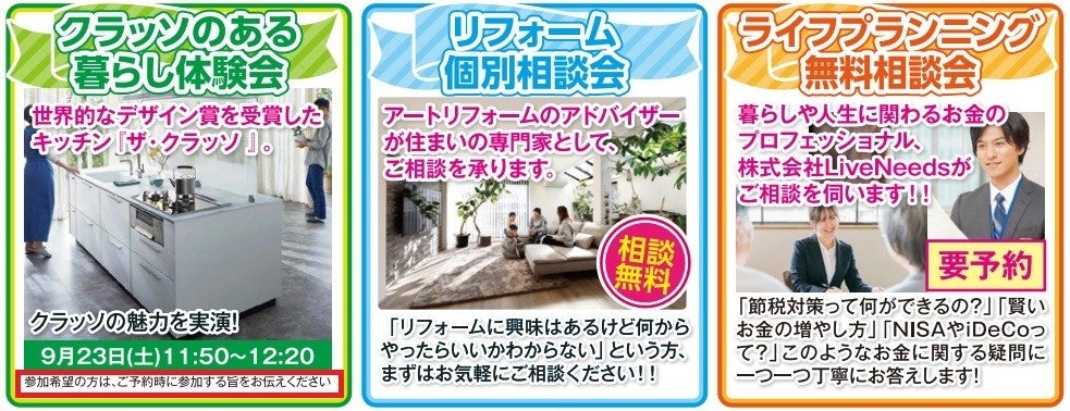 ・内 容:水回りを中心としたリフォーム相談会、ライフプランニング相談会、クラッソのある暮らし体験会(時間限定)