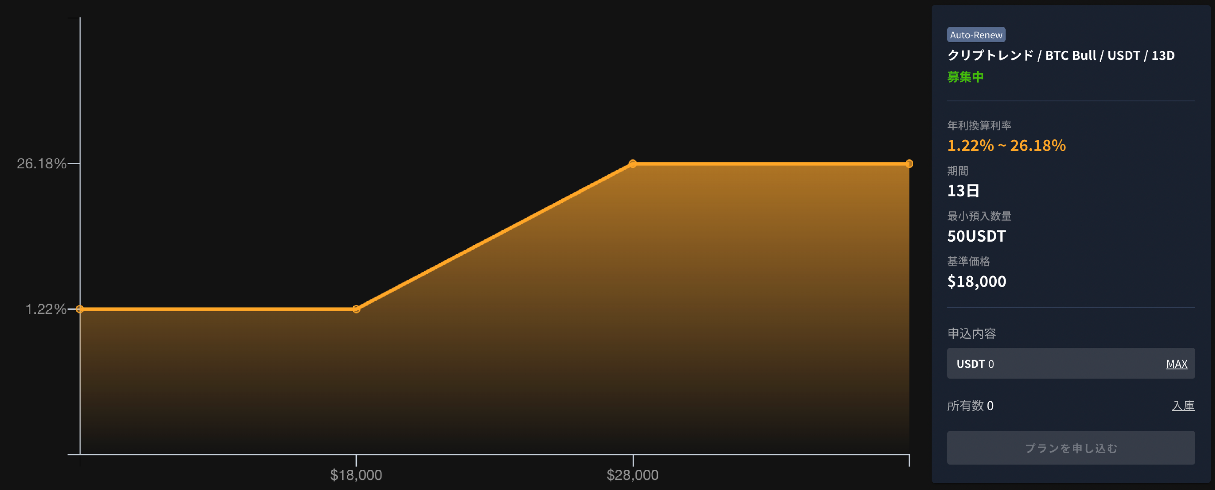 「クリプトレンド」は、仮想通貨価格のトレンド「ブル」「ベア」を予測した上で保有している仮想通貨を貸し付け、基準時点の仮想通貨価格によって、報酬として得られる利息が変化する運用方法です。