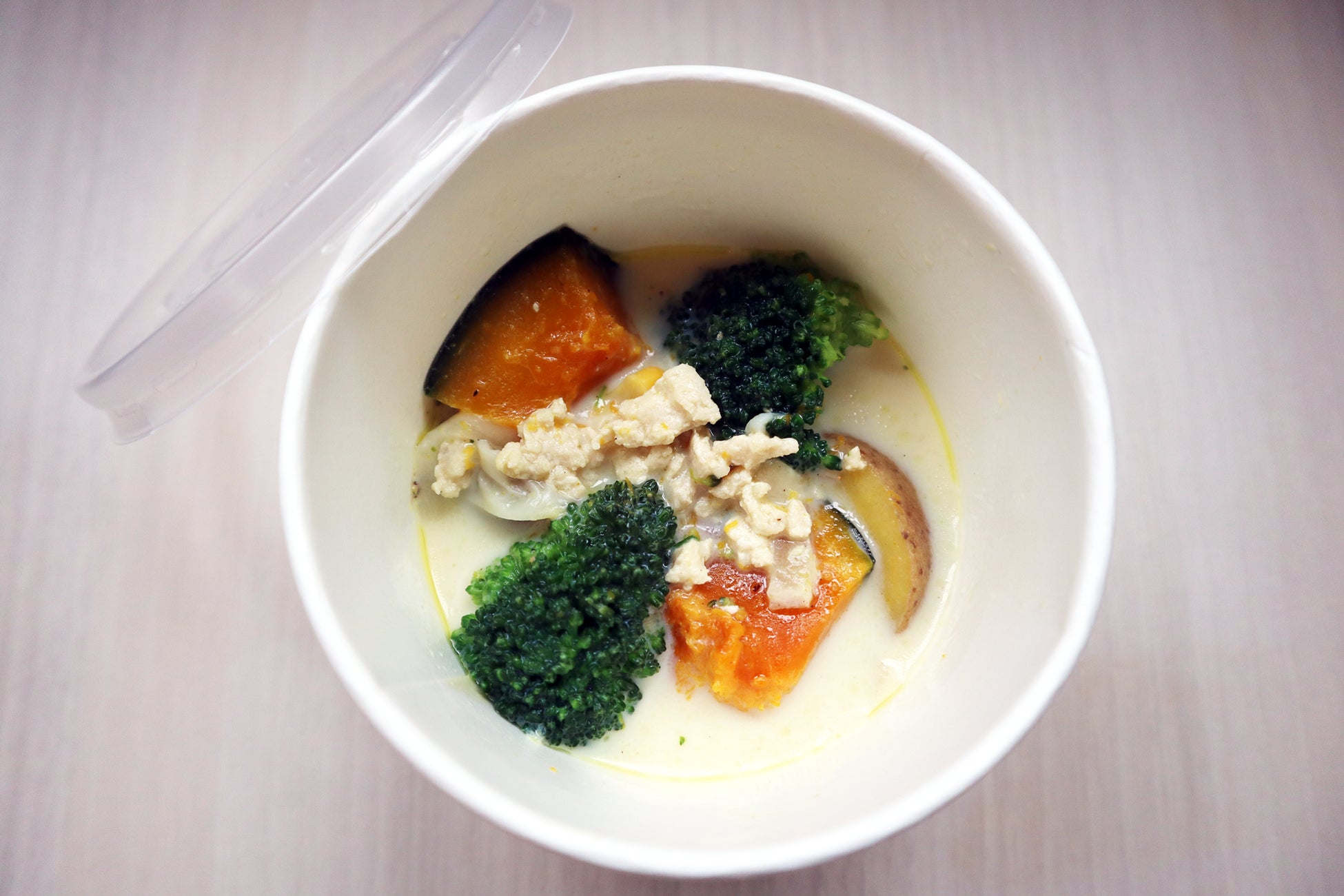 ●特徴:北海道産の野菜(かぼちゃ、じゃがいも、ブロッコリー、コーン、玉ねぎ)とひき肉入り豆乳スープ。