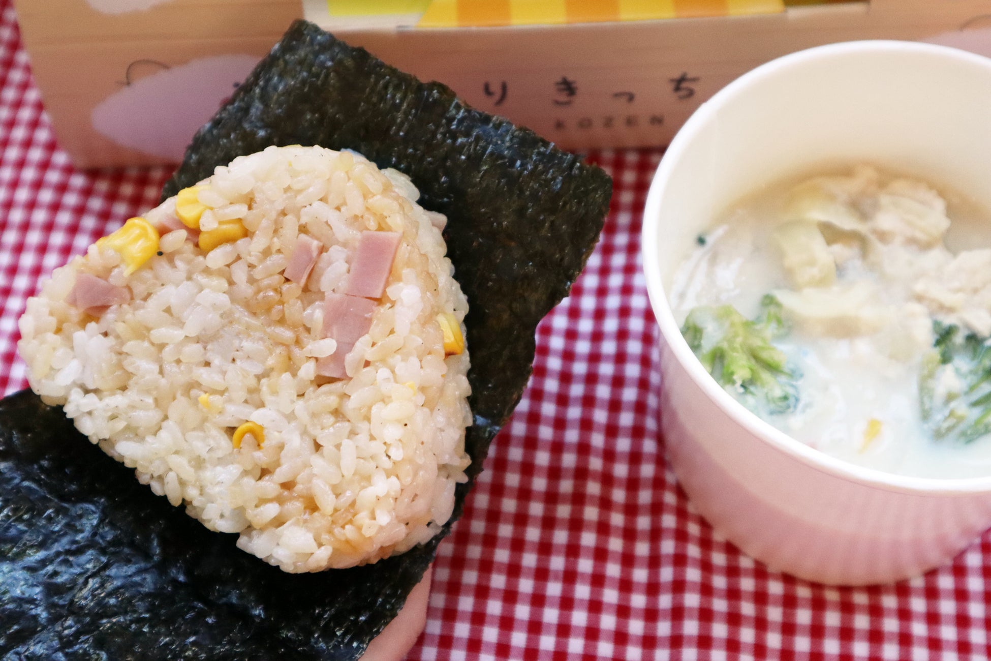 豆乳野菜スープ&おにぎり(ベーコン・コーンのバター風味)のセット販売。直営店「のりきっちんbyKOZEN」で展開