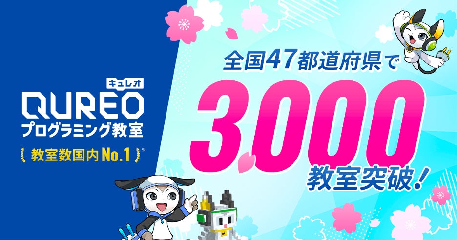 株式会社CA Tech Kidsと株式会社スプリックスとの合弁会社である、プログラミング教材の開発・運営・販売事業を行う株式会社キュレオ(本社:東京都渋谷区、代表取締役社長:上野朝大)は、運営する小学生のためのプログラミング教室「QUREO(キュレオ)プログラミング教室」が、国内47都道府県で3,000教室を突破したことをお知らせいたします。小学生を対象としたプログラミング教室において、引き続き国内No.1の教室数となります(※)。