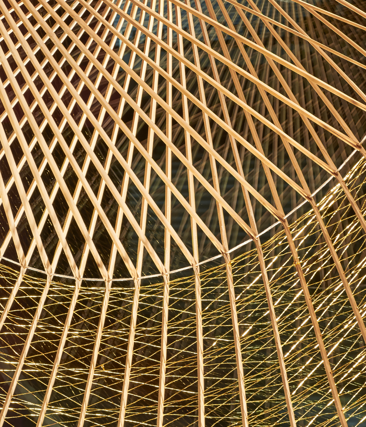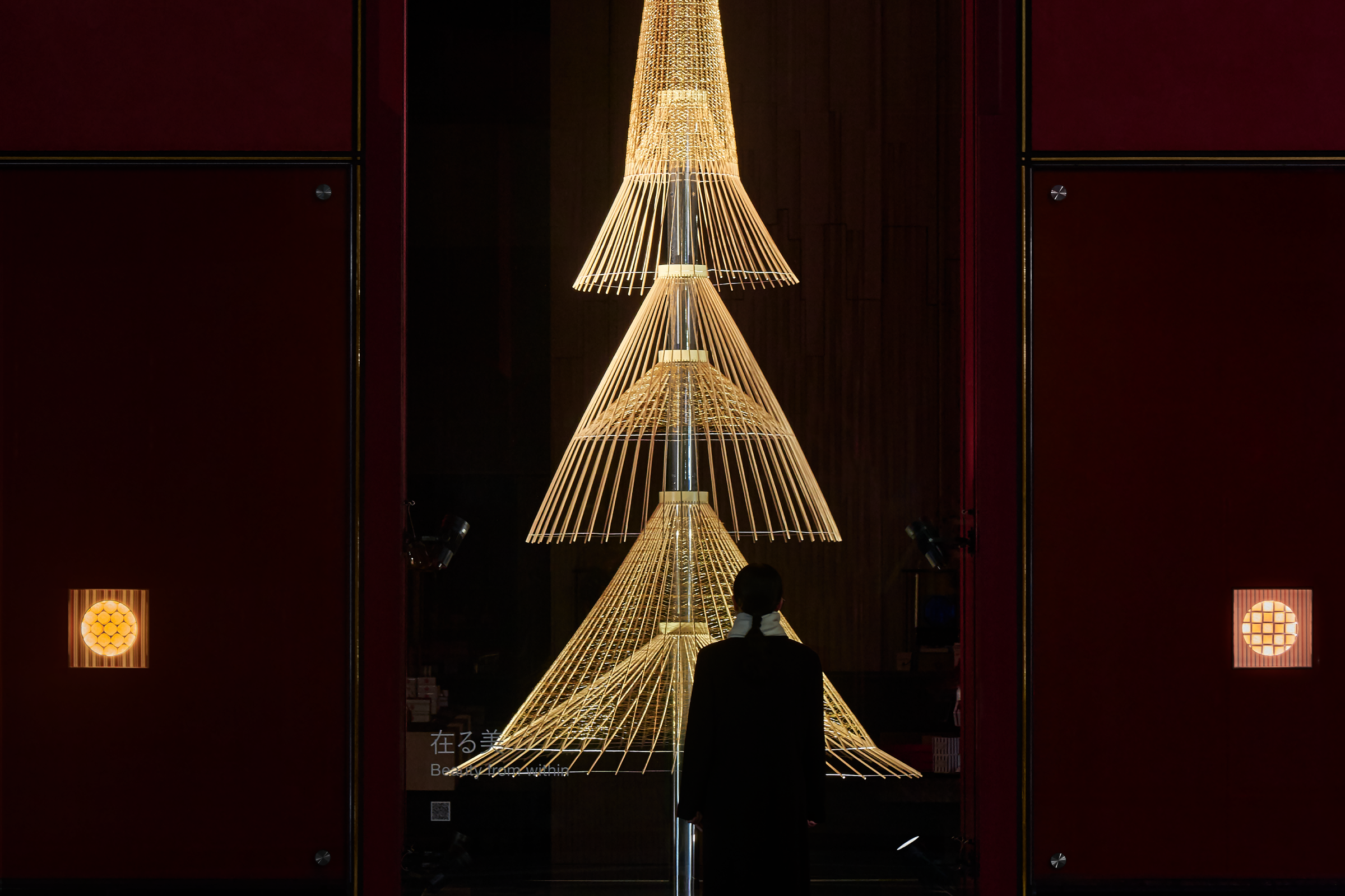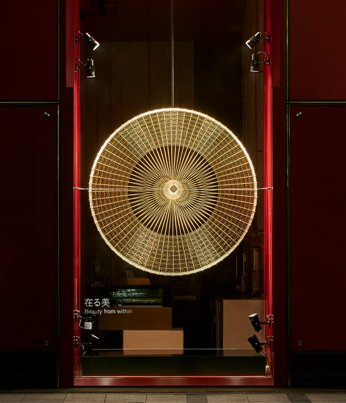 伝統工芸が持つ日本古来の美意識をテーマとし、京都の職人と共にツリーとリースを制作しました。大窓ディスプレイのモチーフとしたのは「和傘」。特に「竹骨と飾り糸」という要素に着目しました。本来傘の内側にあり使用者しか見ることのできない「竹骨と飾り糸」をあえて露出させたデザインはそこに在る美の探求、そして新たな美の定義に取り組んできた資生堂の企業姿勢を表現しています。