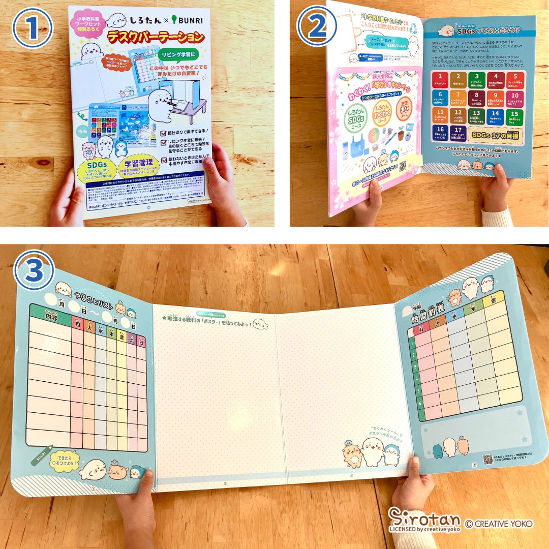株式会社オンワードコーポレートデザイン(本社:東京都千代田区 代表取締役社長:村上 哲)は、株式会社学研ホールディングス(本社:東京都品川区 代表取締役社長:宮原 博昭)のグループ会社である株式会社文理(本社:東京都品川区 代表取締役社長:安達 健一)が3月から新発売する「小学教科書ワーク4科目セット」の特別付録として、今年で25周年を迎えるたてごとアザラシのキャラクター「しろたん」とコラボレーションし、「SDGsを学ぶ」をテーマに「オリジナルデスクパーテーション」とリサイクル素材(R-PET素材)を用いた「持ち運びに便利な持ち手つきケース」、「しろたん巾着(1年生のみ)」を製作しました。