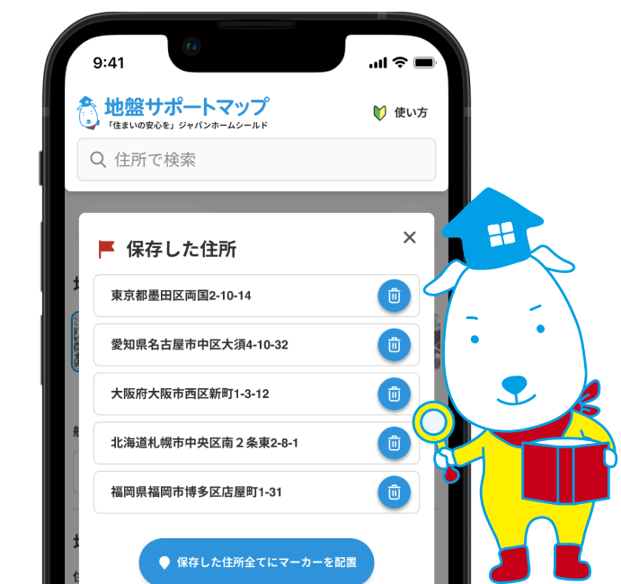 自宅や大切な人の住所など、何度も調べたい住所を5つまで保存できる機能を追加しました。