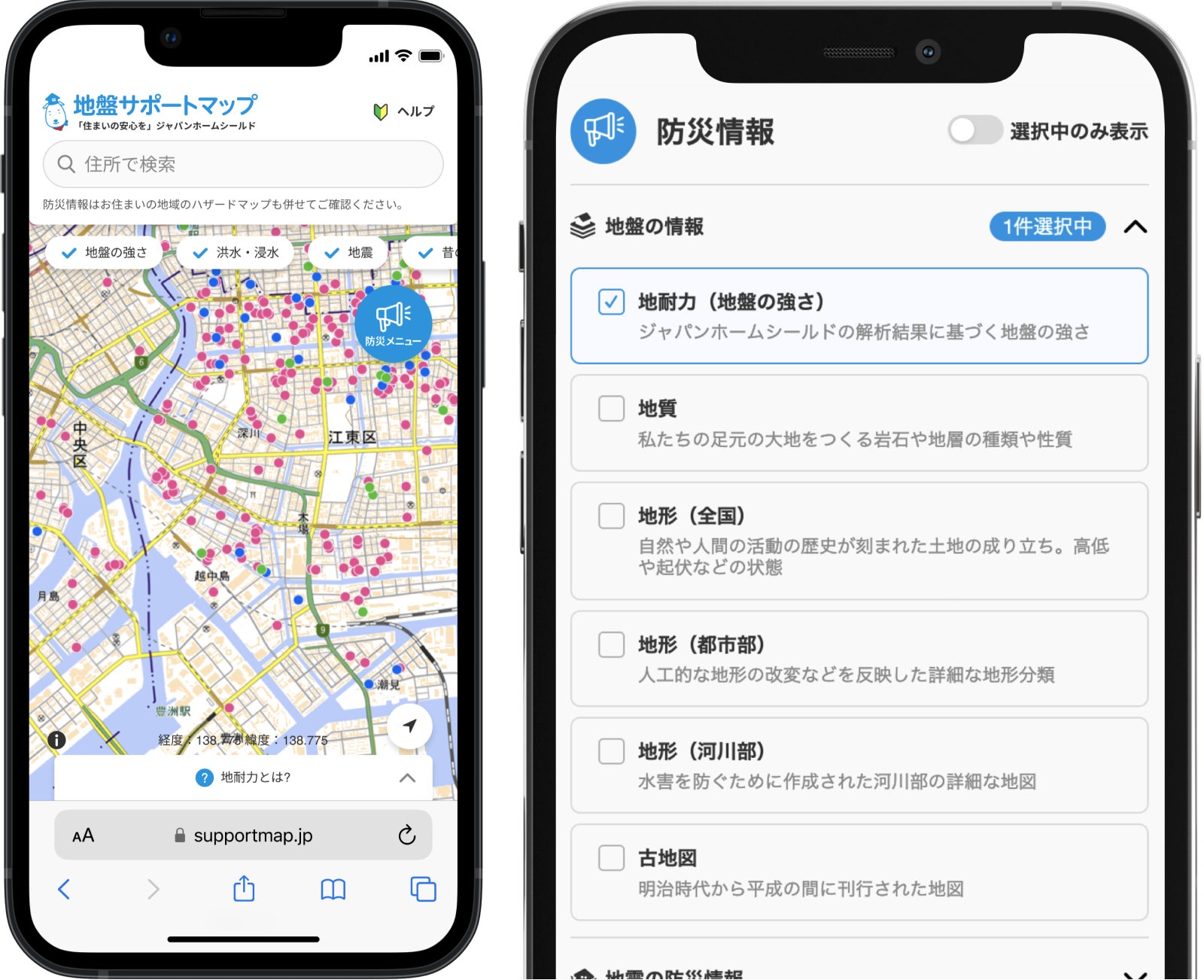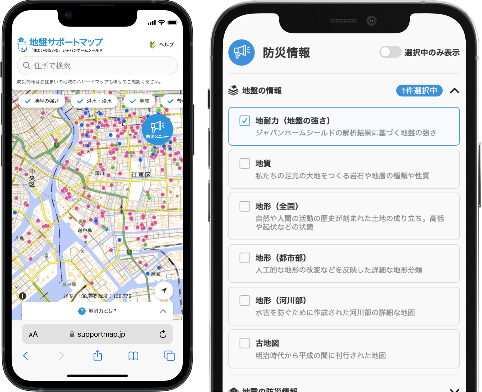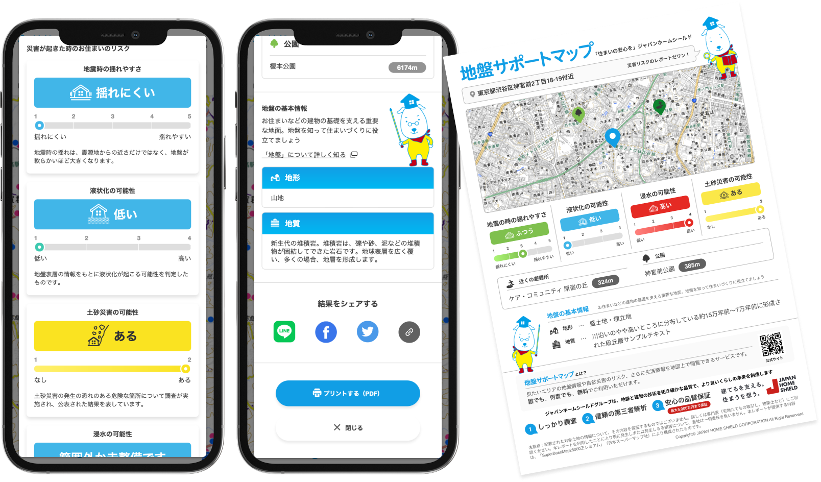 「地盤サポートマップ」は、2015年の一般公開からたくさんの方にご活用いただき、毎月9万閲覧数を獲得する大人気のコンテンツです。今回のリニューアルでは、操作性・利便性が大幅に向上し、自分の街の災害リスクを簡単に確認でき、レポートのシェアや住所保存も1クリックで可能になりました。( https://supportmap.j-shield.co.jp/ )