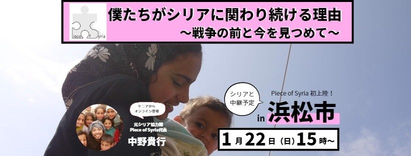 「シリアをまた行きたい国にする」を目標に、シリア及びトルコで2000名以上の子どもたちに教育を届けてきたNPO法人Piece of Syria(代表 中野貴行、以下「Piece of Syria」)は、1/22(日)15:00~ Piece of Syria初となる浜松でのイベント「僕たちがシリアに関わり続ける理由〜戦争の前と今を見つめて〜」を開催いたします。