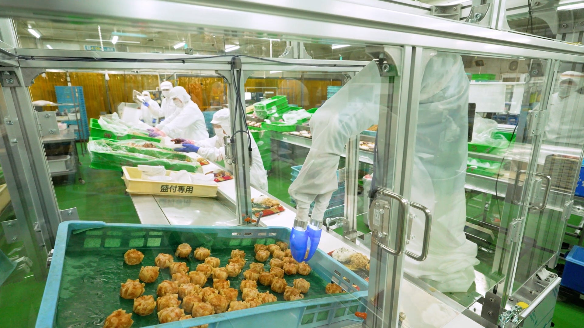 また、人がずらっと並ぶ盛付ラインのうち、部分的な盛付タスクを自動化するために導入されるお客様も多く、その場合、ロボットを安全柵で囲い安全性を担保するとともに、キャスターでロボットを移動することで生産計画にあわせた柔軟な配置も可能です。食材変更時の段取り変えも簡単に行えます。