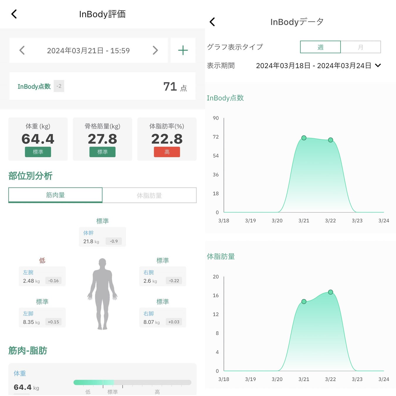 加入後はInBody(インボディ)専用画面がスマホのTRESUL(トレスル)アプリ上に表示され、InBody(インボディ)本体に表示されたコードをTRESUL(トレスル)アプリから読み取ることで簡単に結果を反映することできます。反映された結果は専用画面から前回比較やグラフによる推移を確認できます。
