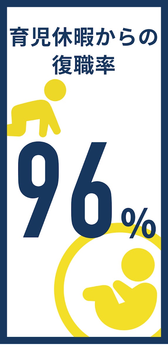 当社の女性管理職割合が高い背景には、職場環境や制度、女性に限らず全従業員のキャリアパス支援制度が整っていることが要因と考えています。その結果、女性の育児休業からの復帰率は96%と、高い数字を示しています。ライフスタイルに変化が伴ったとしても長く働き続けることができるため、当社の女性管理職の割合は高い結果となっています。