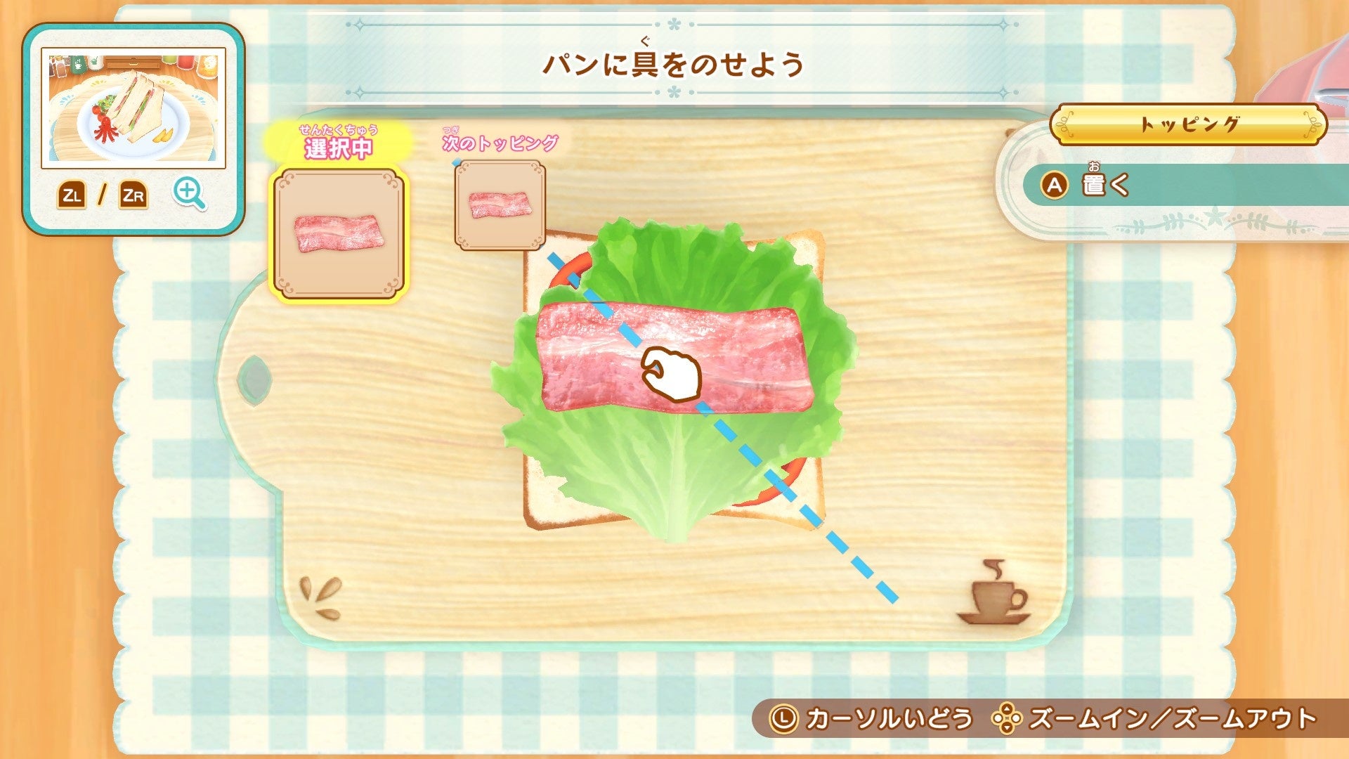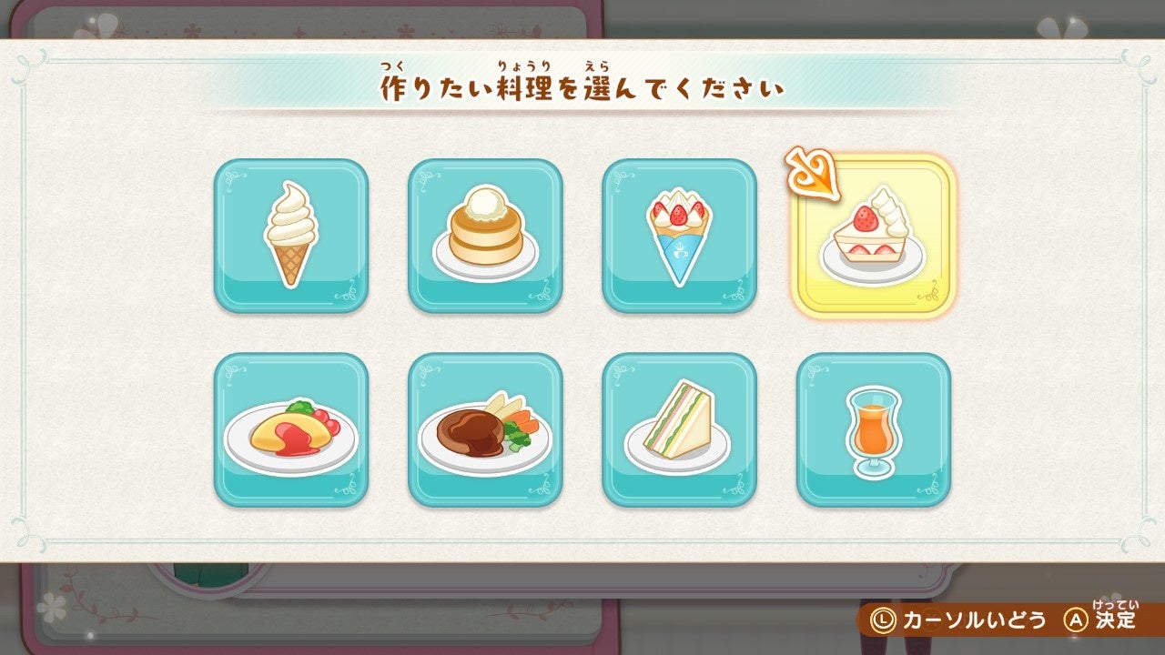 「パンケーキ」「クレープ」「ハンバーグ」「ケーキ」「オムレツ」などのお料理制作は、13種類のミニゲーム形式で体験。