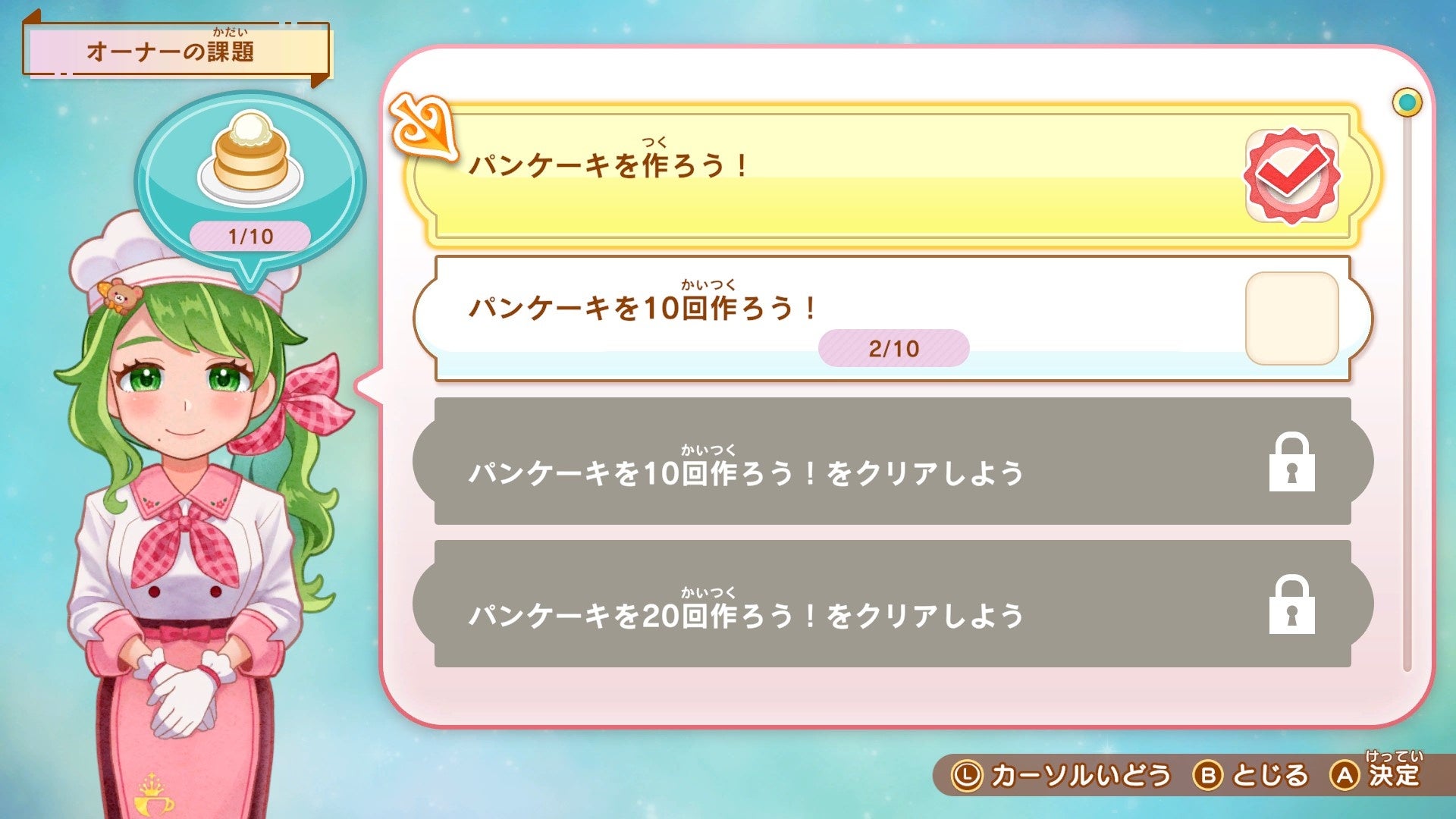 また、「〇〇を10回作る」や「〇〇を使って料理を作る」など、オーナーの課題となるミッションがあるので、挑戦してみよう!