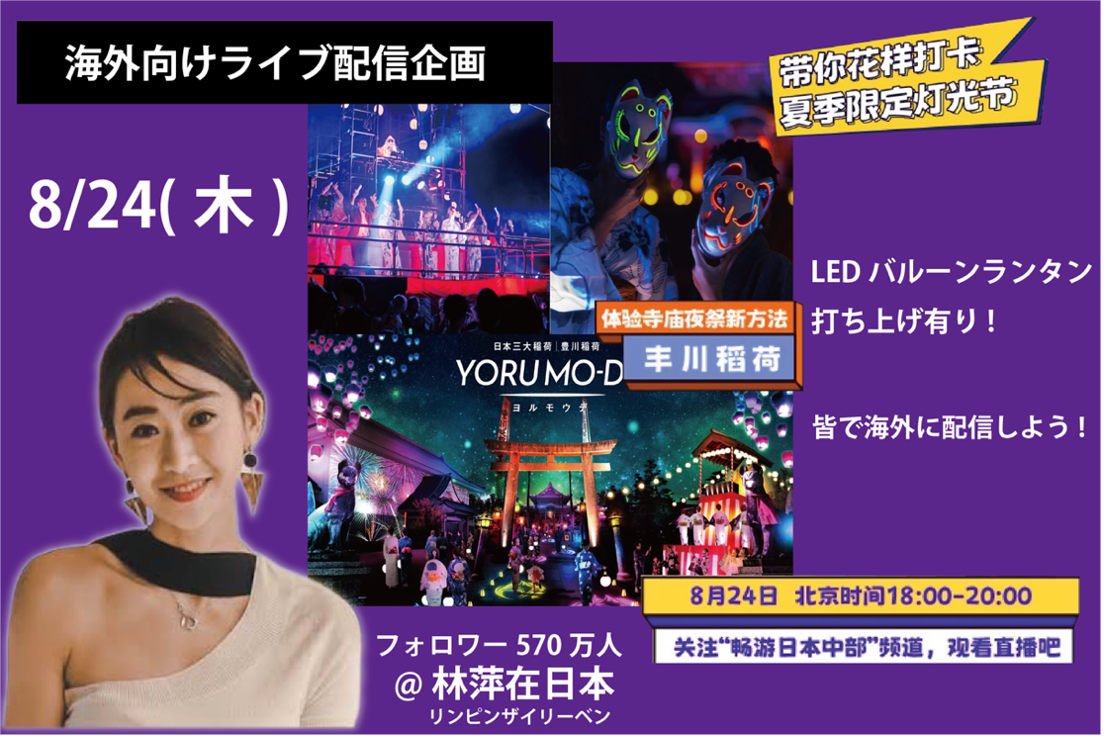 8月24日(木)にはフォロワー約570万人を誇る林萍在日本(リンピンザイリーベン)氏による海外向け配信企画を予定しており、週末以外では1日限定でLEDバルーンランタン打ち上げを予定。