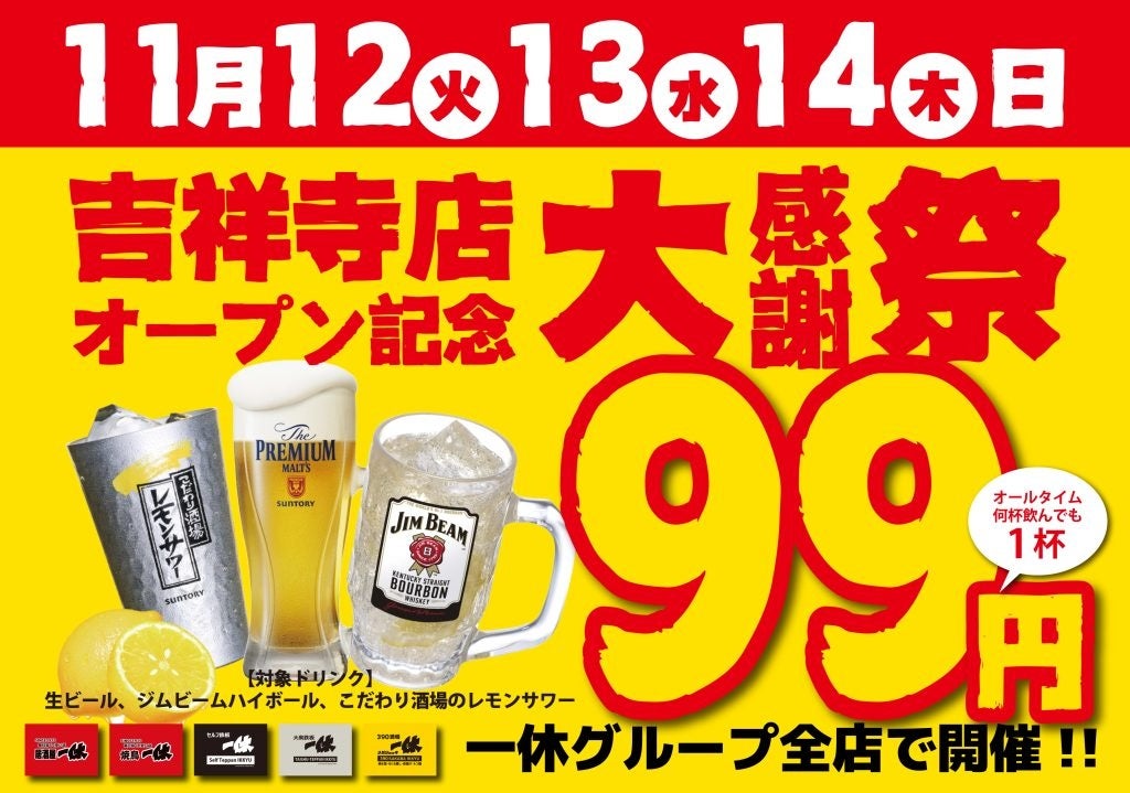 【プレミアムモルツ税込99円】11月12~14日『居酒屋一休吉祥寺店オープン記念大感謝祭』を一休全店で開催!こだわり酒場レモンサワー、ジムビームハイボールも1杯99円でご提供いたします!
