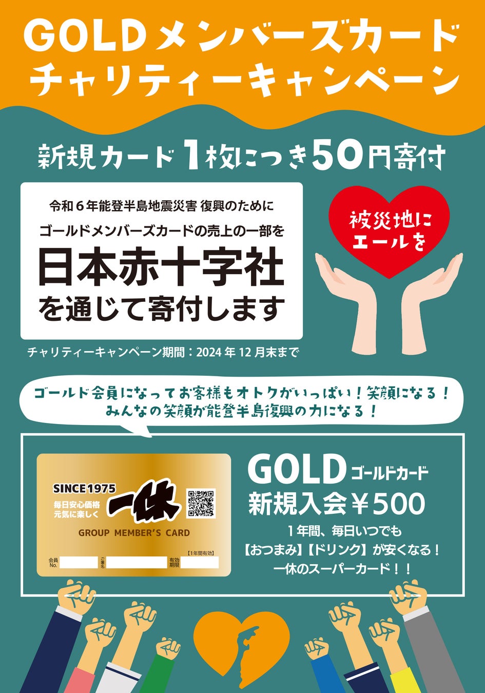 この地震を受け、居酒屋一休は被災地支援の取り組みとして2024年12月末までの期間中ゴールド会員新規入会1枚につき50円を日本赤十字社を通し被災地に毎月寄付をしております。