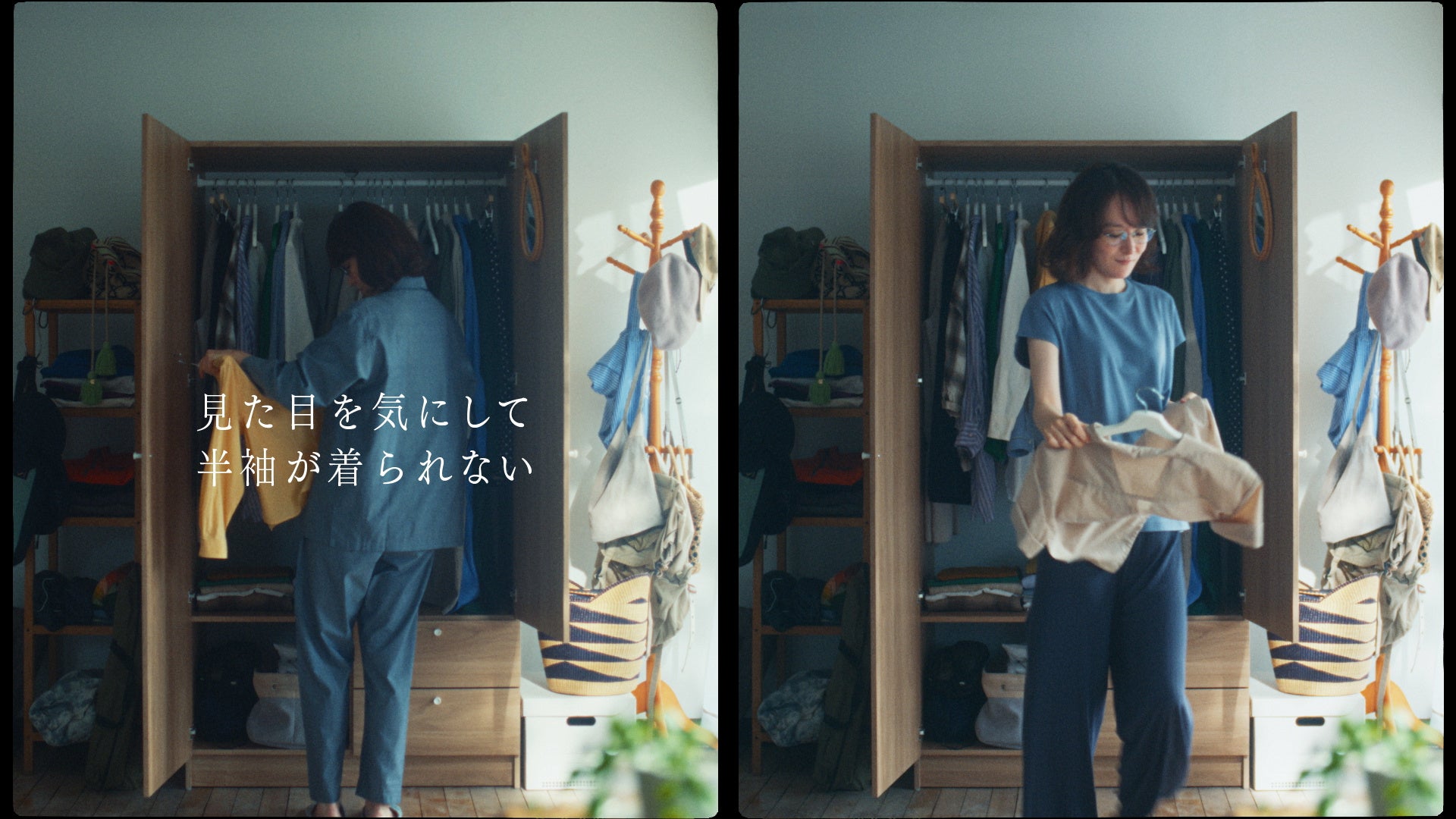 会社に出勤するため、クローゼットの前で半袖を手に取るも、患部の見た目を気にして今日も長袖を着ていく。