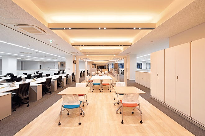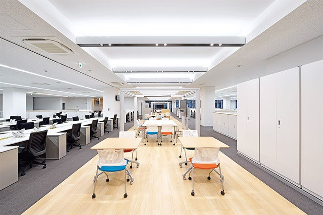 執務室に設けられているコラボレーションエリアでは、天井折り上げのボックスに設置した間接照明で2700K~5000Kまでの調色が可能な照明として、日の移ろいに合わせて光色を変化させ、働く人のサーカディアンリズム(24時間周期の生体リズム)の形成を促しています。